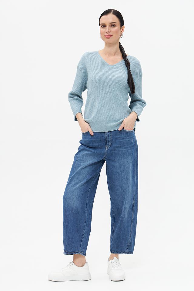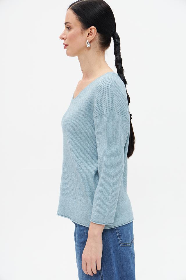 Пуловер имеет классический V-образный вырез, который подчеркивает линию шеи и декольте. Свободный крой обеспечивает комфорт и свободу движений, а рукава три четверти делают его подходящим для любого времени года.