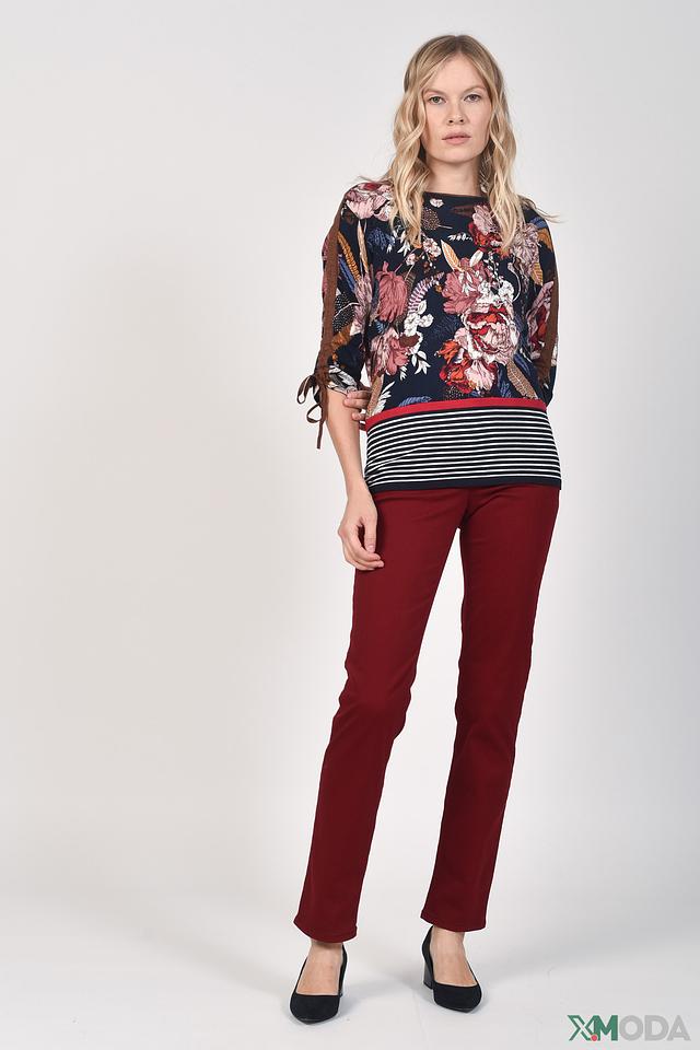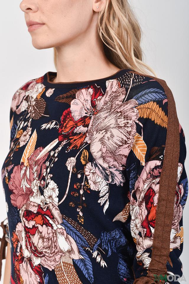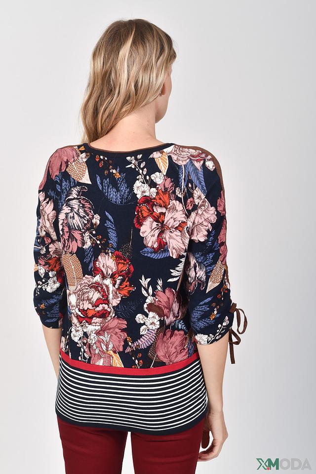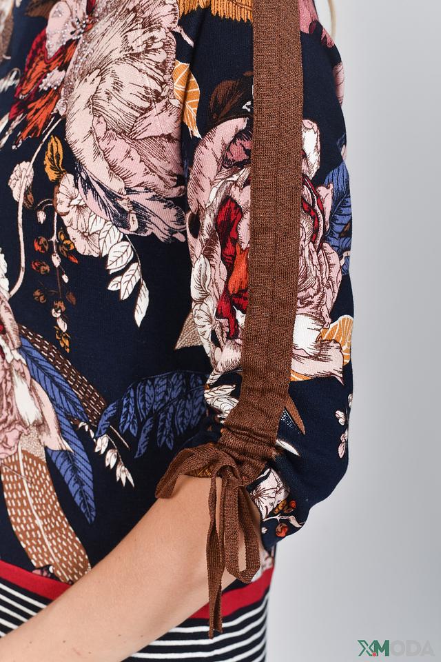 Женский пуловер Betty Barclay темно-синего цвета с ярким цветочным принтом и рукавами 3/4 с завязками. Модель выполнена из мягкой вискозы с добавлением полиамида для сохранения формы. Состав: вискоза 79%, полиамид 21%