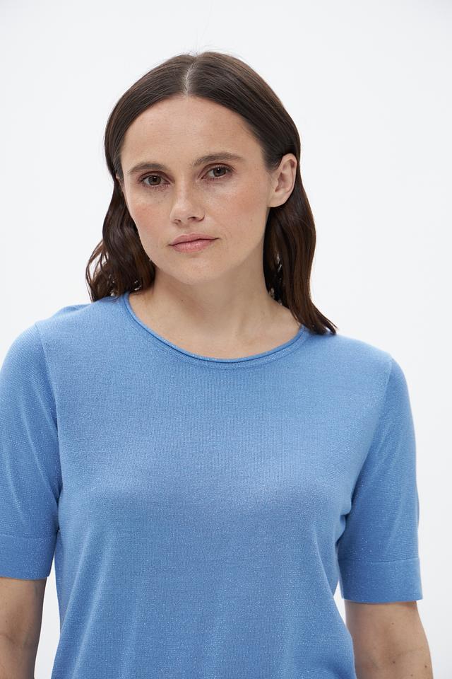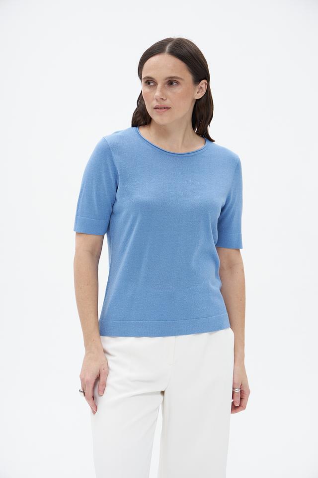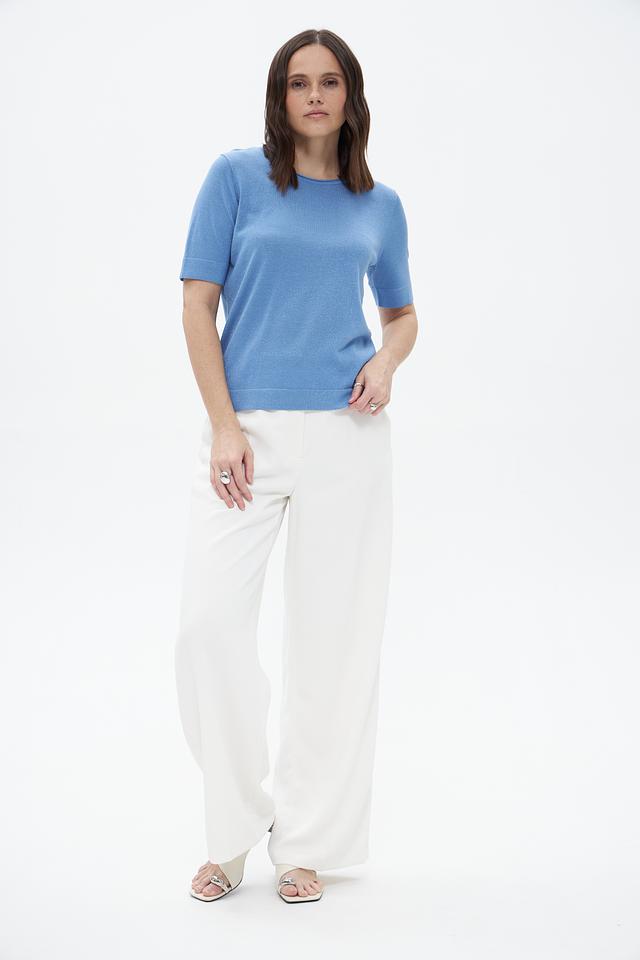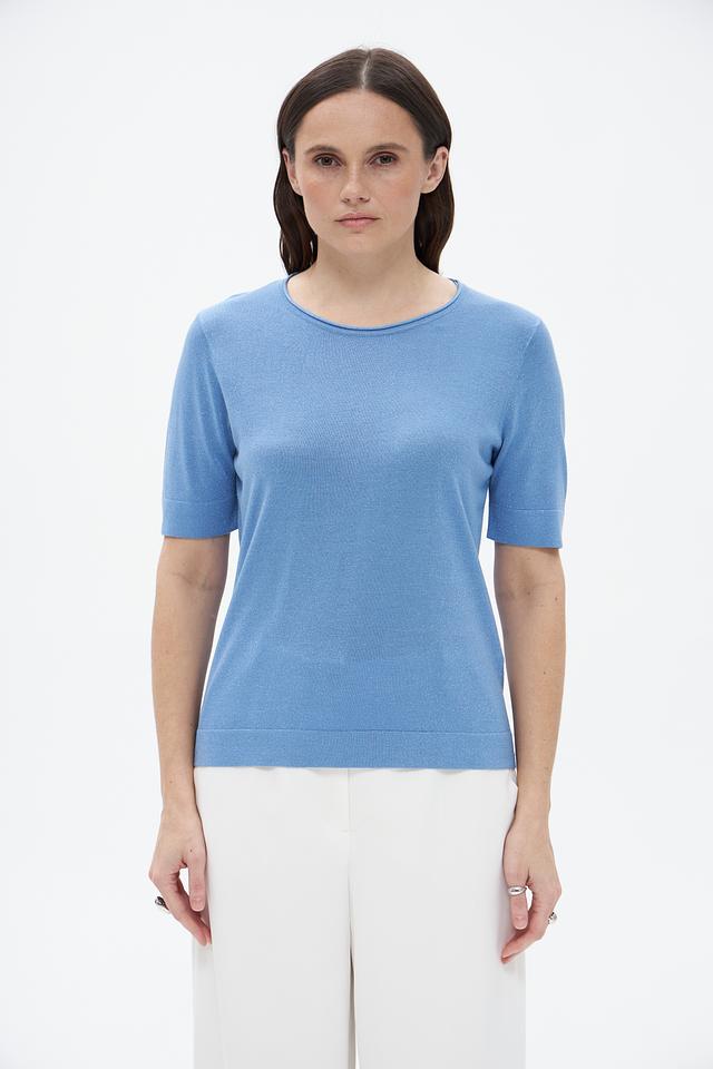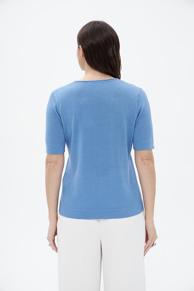 Голубой пуловер от Bianca с коротким рукавом и круглым вырезом – идеальный выбор для создания стильного и комфортного образа. Изготовлен из мягкой вискозы с добавлением металлизированной нити, что придает изделию деликатный блеск. Состав: вискоза 80%, метализ.нить 20%