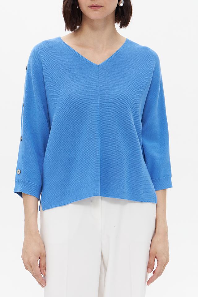 Женский пуловер Bianca голубого цвета с рукавами 3/4 и декоративными пуговицами. Изготовлен из мягкого сочетания полиакрила и хлопка, обеспечивающего комфорт и удобство в носке. Состав: полиакрил 55%, хлопок 45%