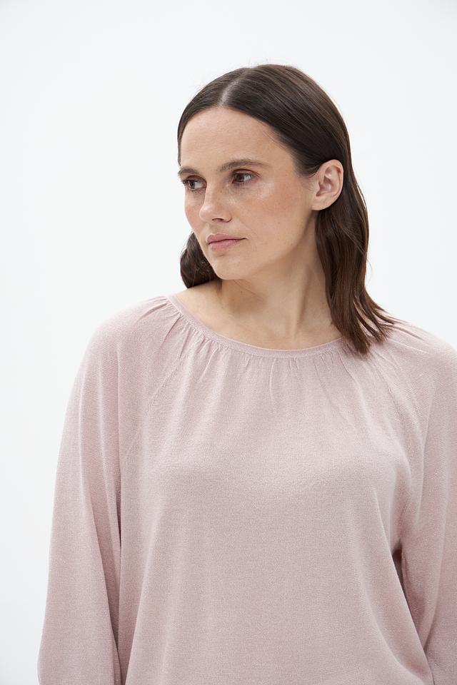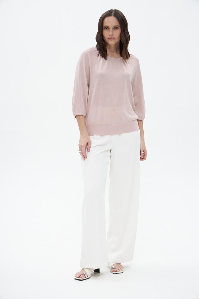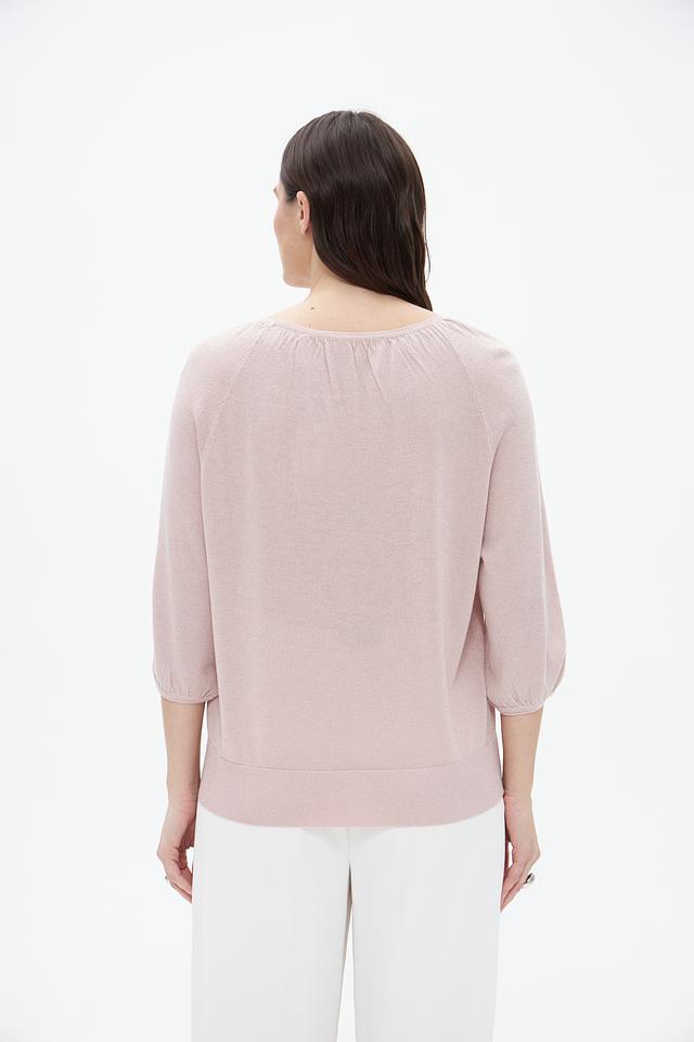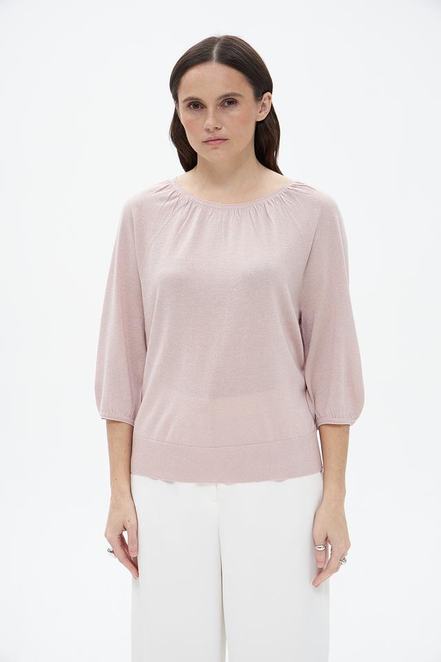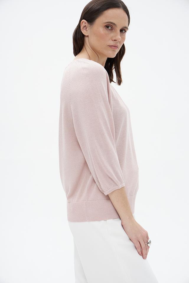 Женский пуловер Bianca нежно-розового цвета с рукавом 3/4 и округлым вырезом. Модель выполнена из мягкой вискозы с добавлением металлизированной нити, что придает изделию легкий блеск и изысканность. Состав: вискоза 80%, метализ.нить 20%