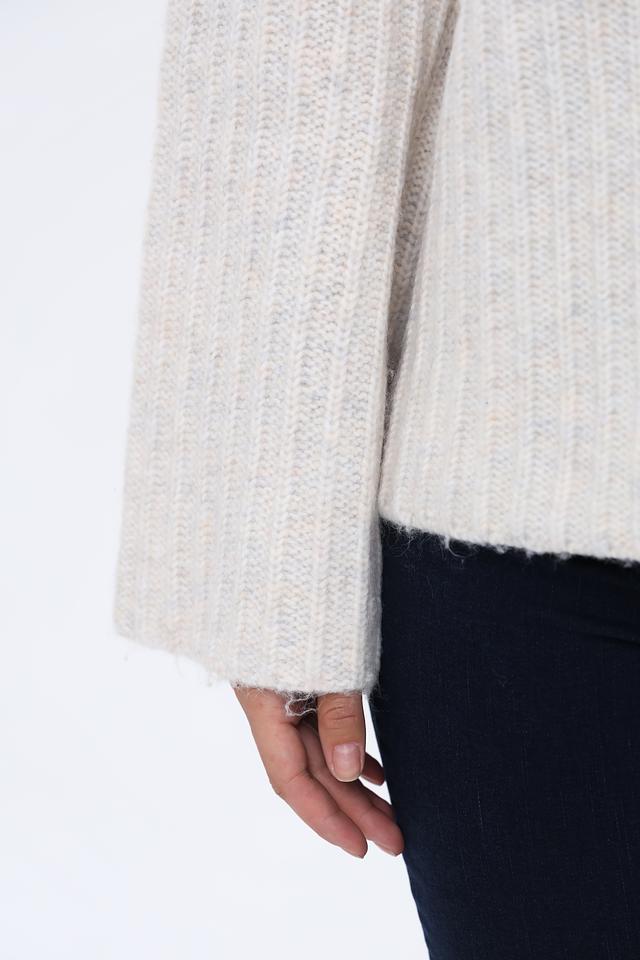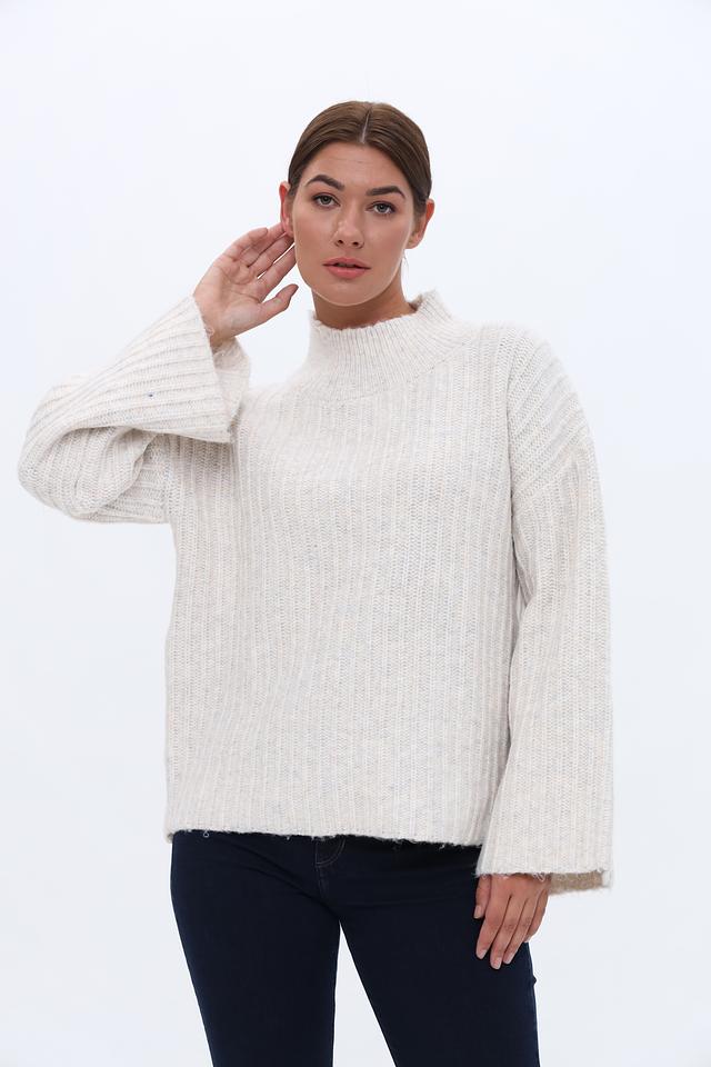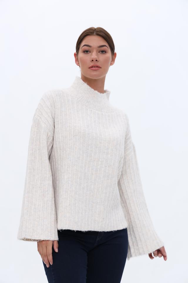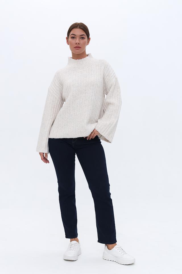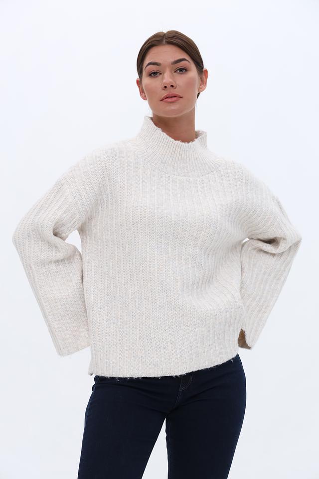 Пуловер имеет свободный крой, который обеспечивает комфорт в носке, а рукава-колокола добавляют образу женственности и оригинальности. Воротник-стойка подчеркивает линию шеи и делает модель более интересной.