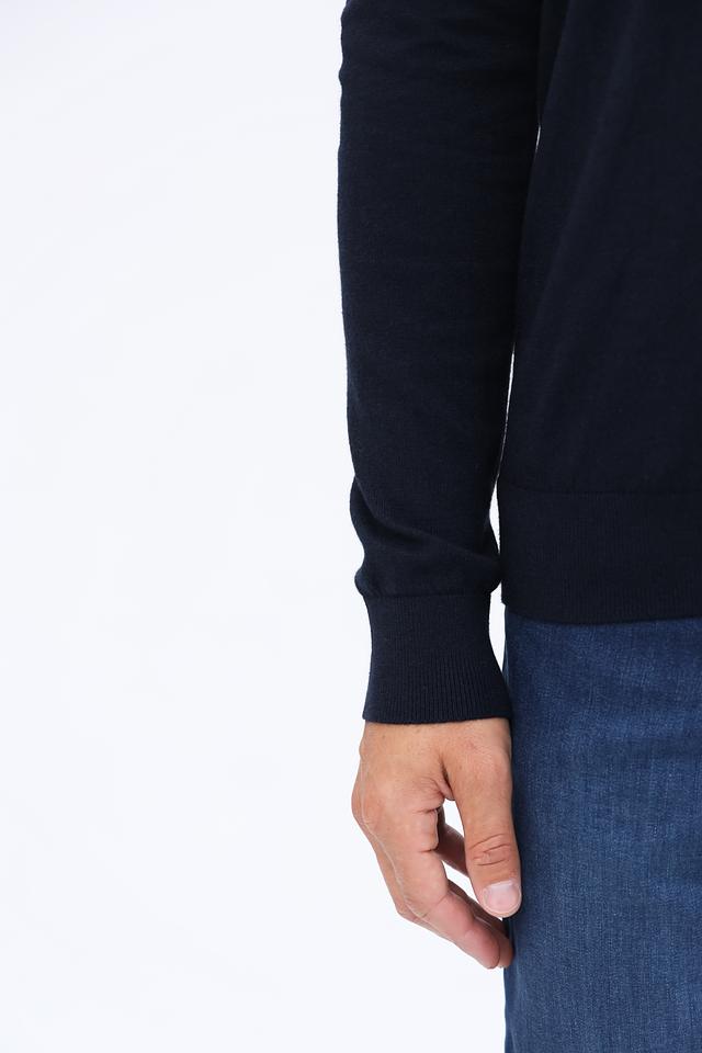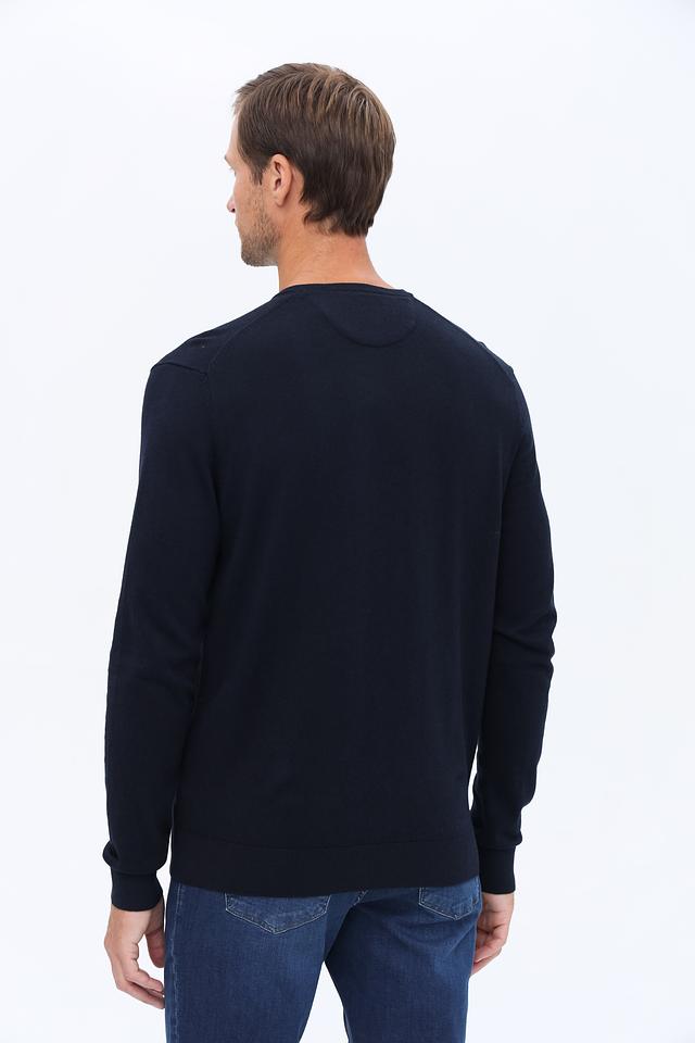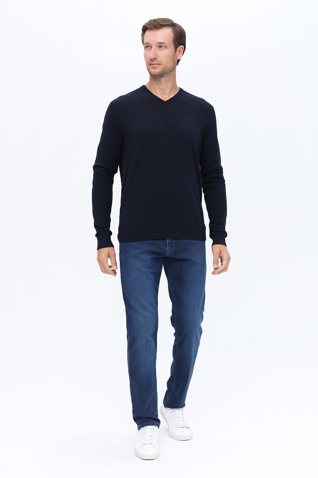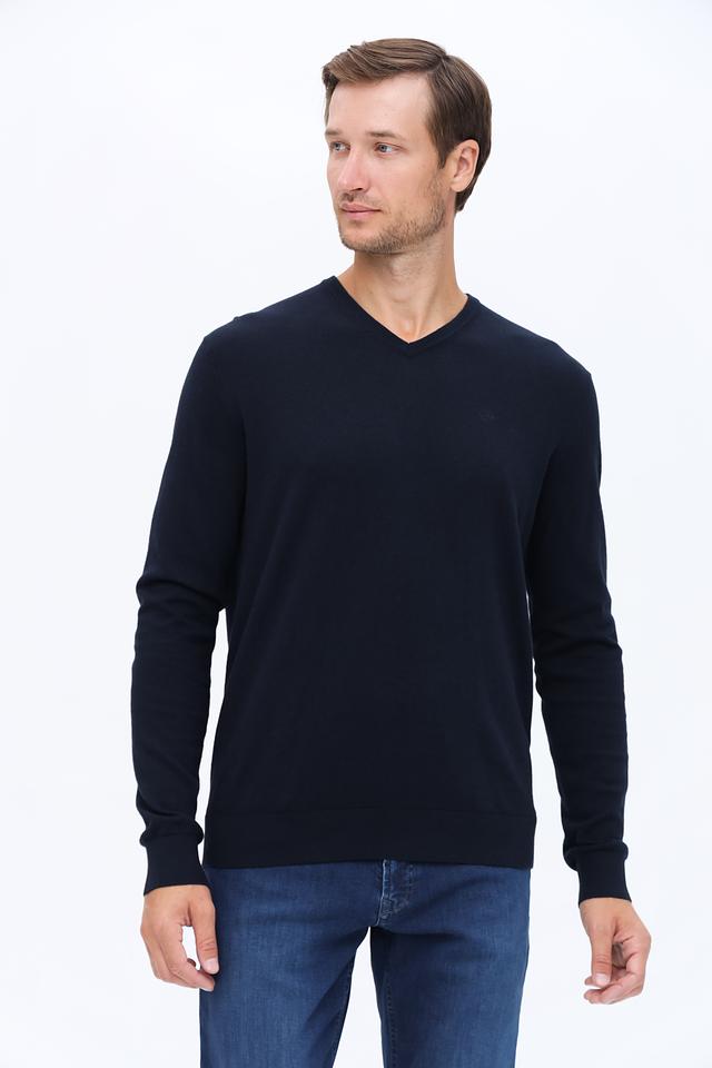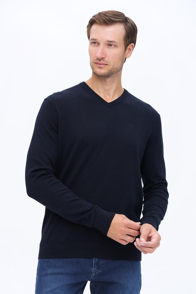Модель имеет классический крой с V-образным вырезом, который подчеркивает мужественность силуэта. Тёмно-синий цвет делает этот джемпер универсальным элементом гардероба, легко сочетающимся с различными стилями одежды.