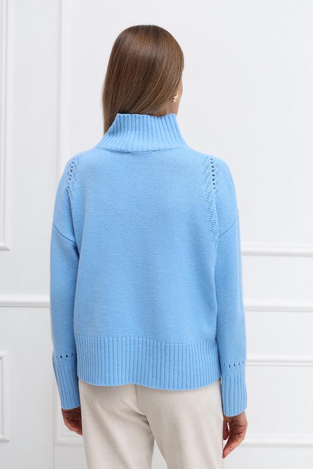 Женский пуловер Catnoir голубого цвета с высоким горлом и декоративными вырезами на плечах. Изготовлен из 100% шерсти, обеспечивающей комфорт и тепло. Стильный и уютный выбор для создания модных образов. Состав: шерсть 100%
