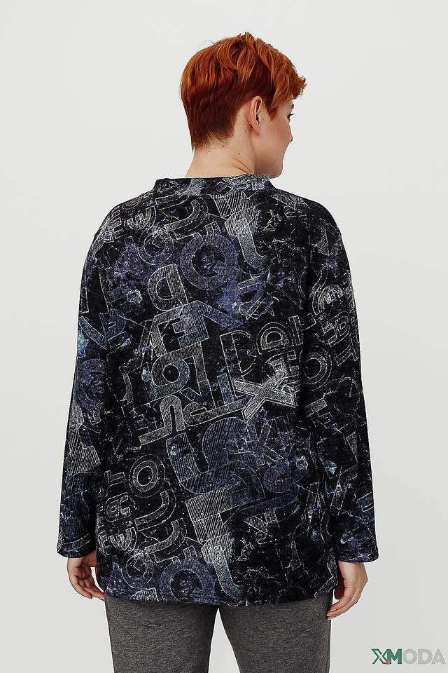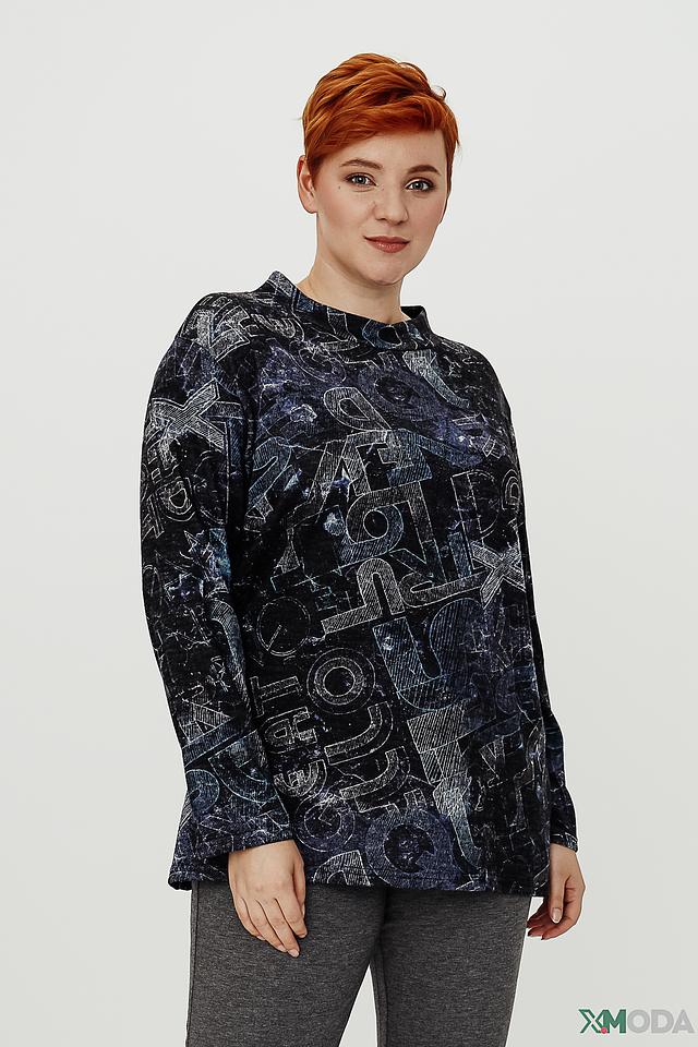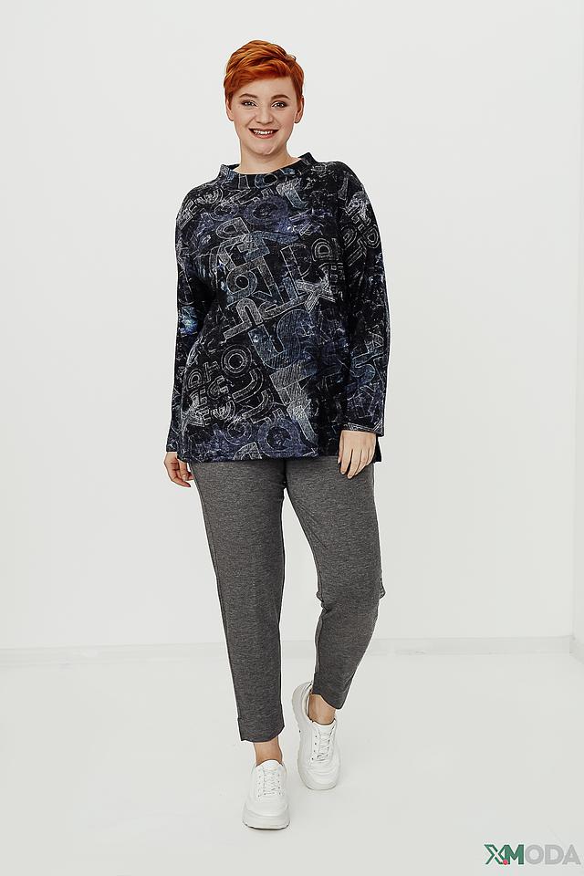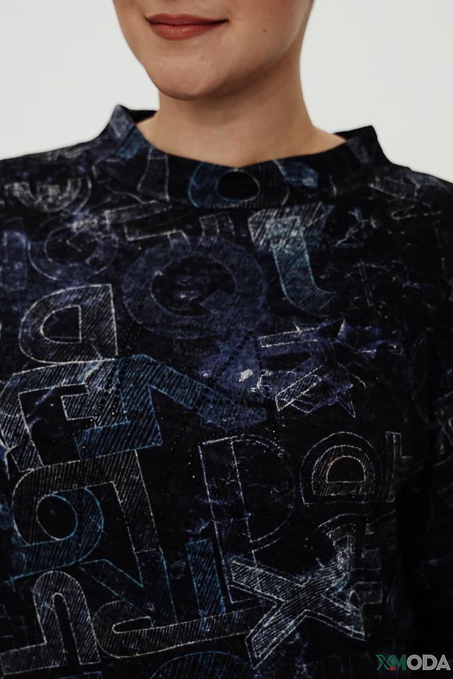 Пуловер имеет свободный крой и круглый вырез горловины. Его главная особенность – эффектный принт, состоящий из различных букв и символов, выполненных в синих и серых тонах. Этот принт делает модель уникальной и привлекательной.