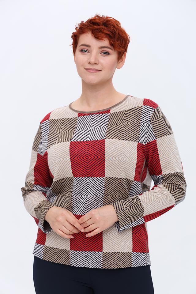 Пуловер имеет оригинальный дизайн с геометрическим принтом в виде ромбов, выполненным в красных, бежевых и серых тонах. Круглый вырез горловины и длинные рукава делают его универсальным для различных образов.