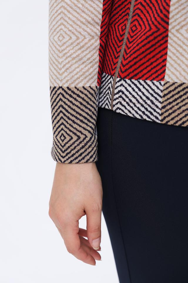 Женский пуловер Frank Walder красного и бежевого цвета с геометрическим принтом в виде ромбов. Модель выполнена из мягкого трикотажа с добавлением вискозы и эластана, обеспечивающего комфорт и свободу движений. Состав: полиэстер 60%, вискоза 38%, эластан 2%