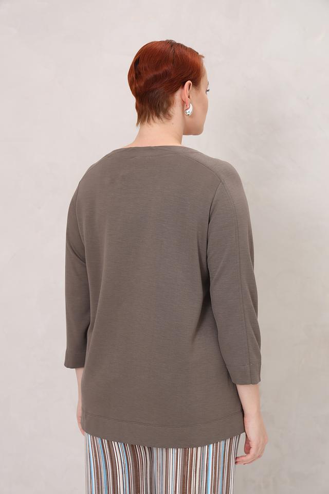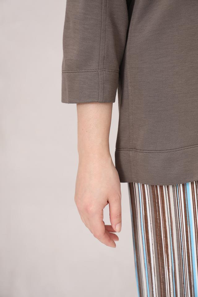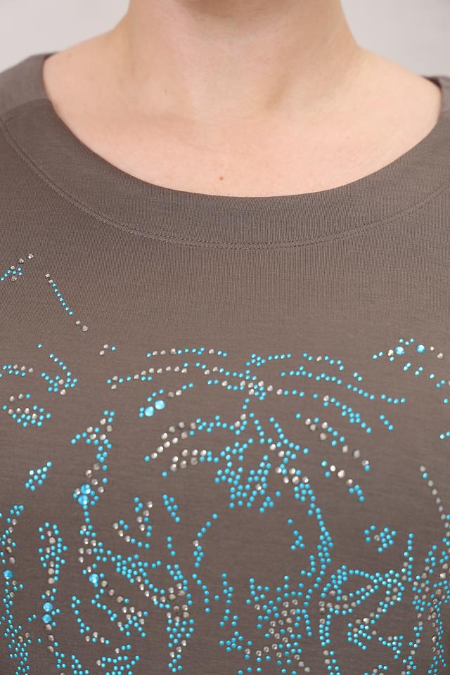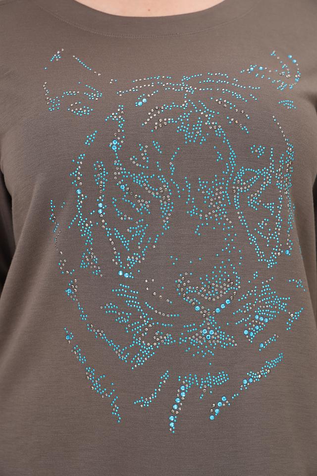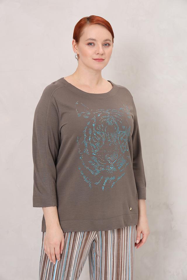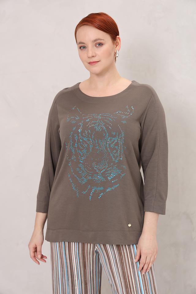 Основной цвет пуловера – коричневый, который отлично сочетается с ярким принтом в виде тигра, выполненным с использованием бисера. Принт придает образу динамичность и индивидуальность. Круглый вырез горловины и рукава 3/4 делают модель универсальной и подходящей для различных случаев.