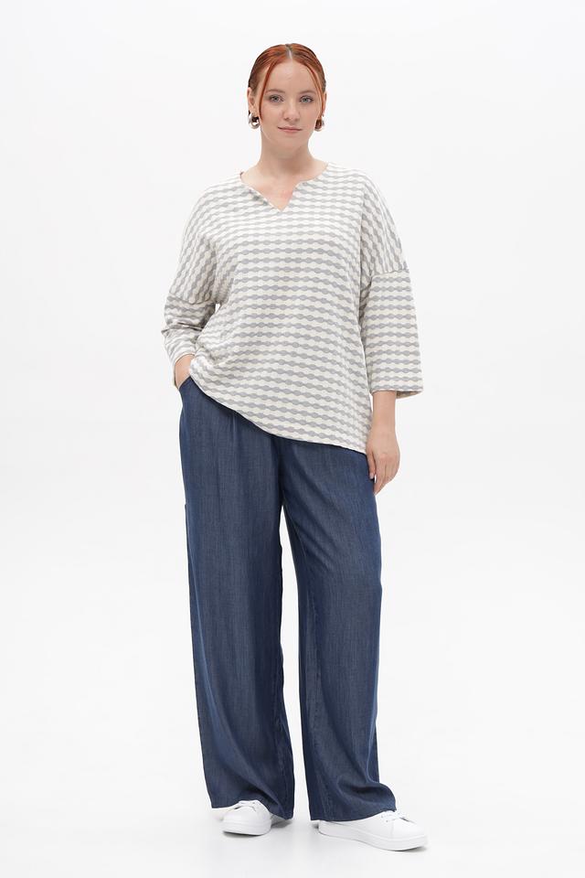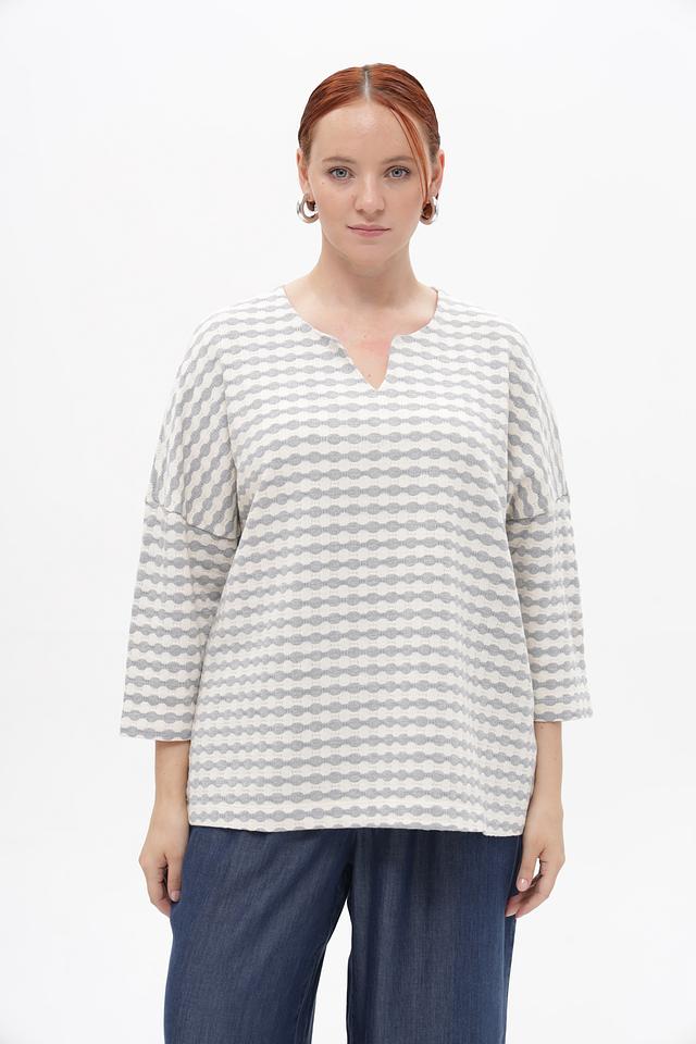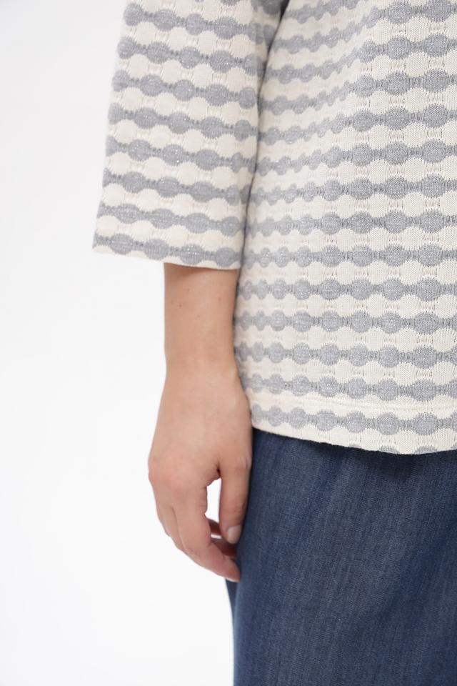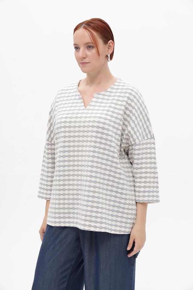 Модель имеет свободный крой, который обеспечивает комфорт в носке, а V-образный вырез горловины подчеркивает женственность силуэта. Рукава длиной 3/4 делают этот пуловер универсальным для любого времени года.
