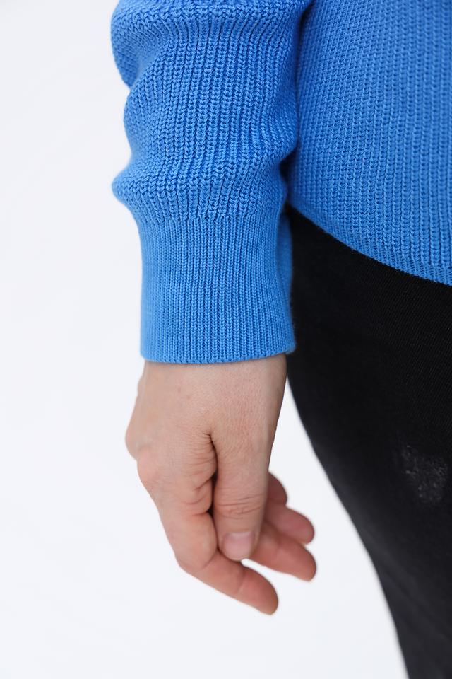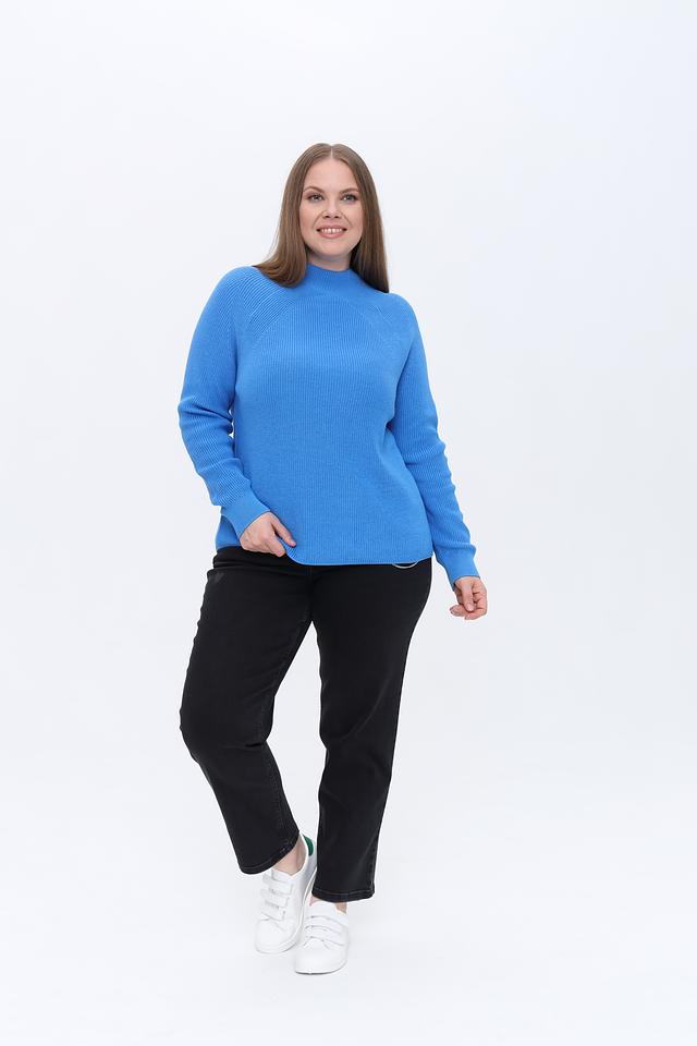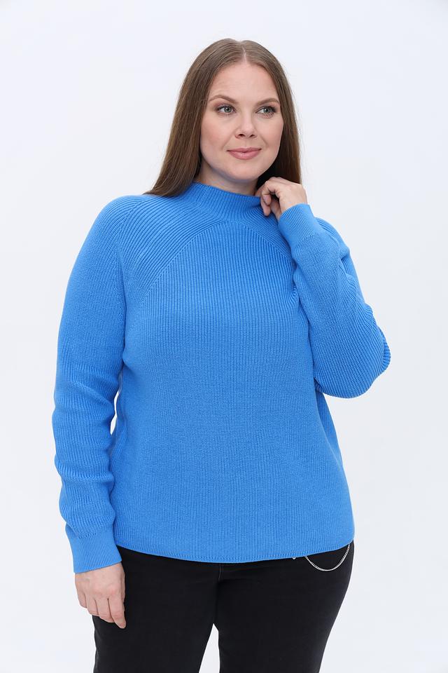 Пуловер имеет прямой крой и высокий горловину, что придает ему элегантный вид. Текстурная вязка добавляет изделию объема и оригинальности. Голубой цвет пуловера универсален и легко сочетается с другими элементами одежды.