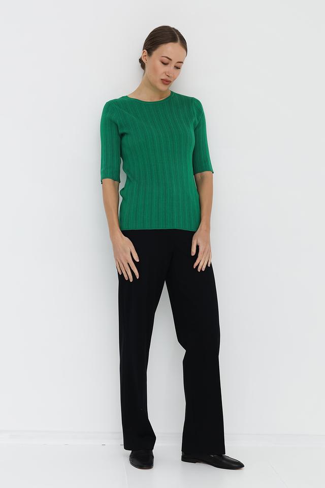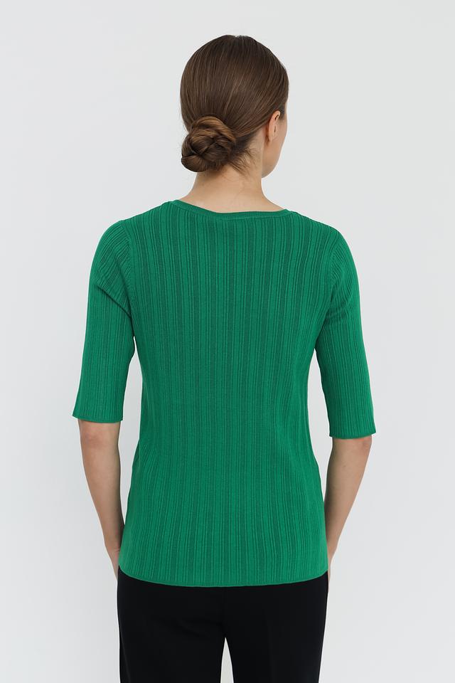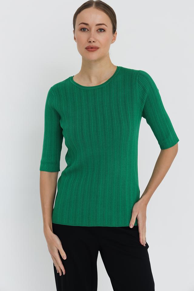 Модель имеет прямой крой, круглый вырез горловины и короткий рукав, что делает его идеальным для тёплой погоды или для ношения под жакет или кардиган. Текстура изделия выполнена в виде вертикальной рубрики, что придает ему особую изысканность.