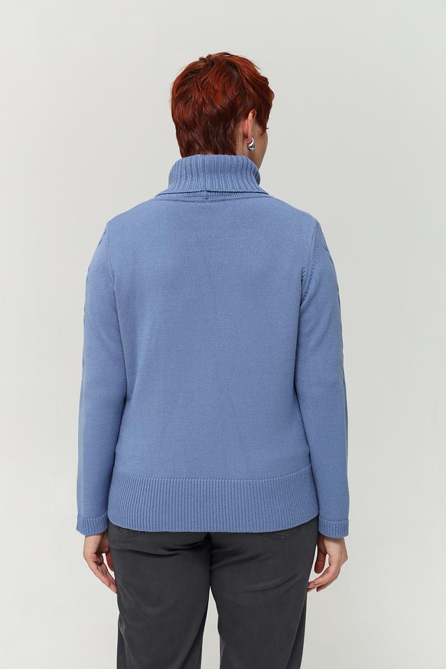 Пуловер имеет высокий воротник-стойку, который не только согревает в прохладную погоду, но и придает образу элегантность. Передняя часть украшена рельефным узором в виде кос, добавляющим изделию текстуру и оригинальность.