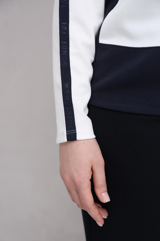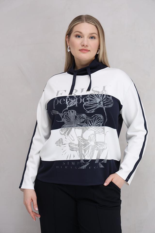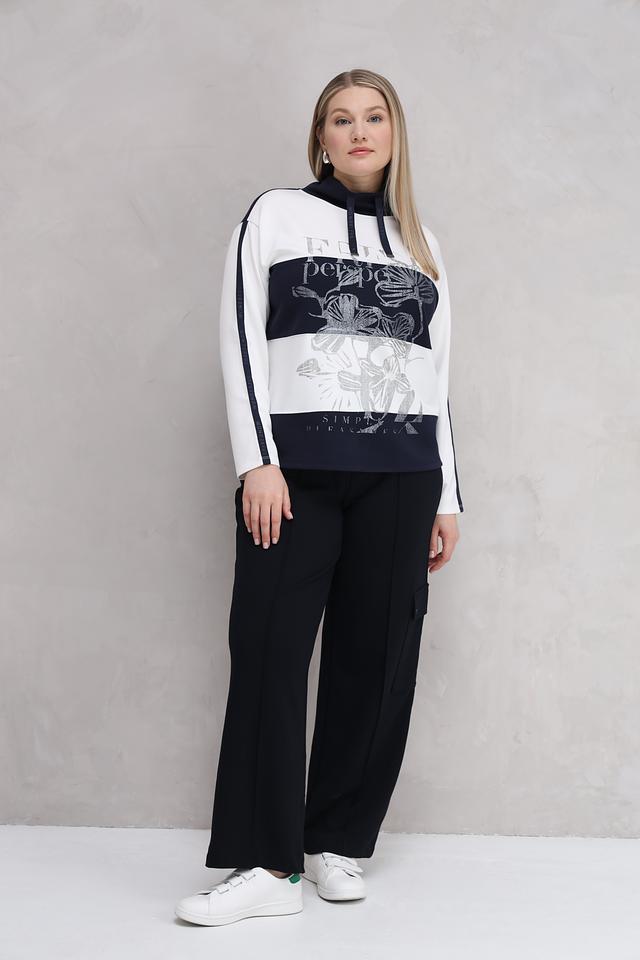 Женский пуловер Lebek белого и тёмно-синего цвета с ярким принтом бабочек. Модель с удобным капюшоном и декоративными шнурками. Изготовлен из мягкого и приятного к телу сочетания полиэстера, вискозы и эластана. Состав: полиэстер 50%, вискоза 45%, эластан 5%