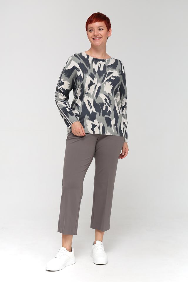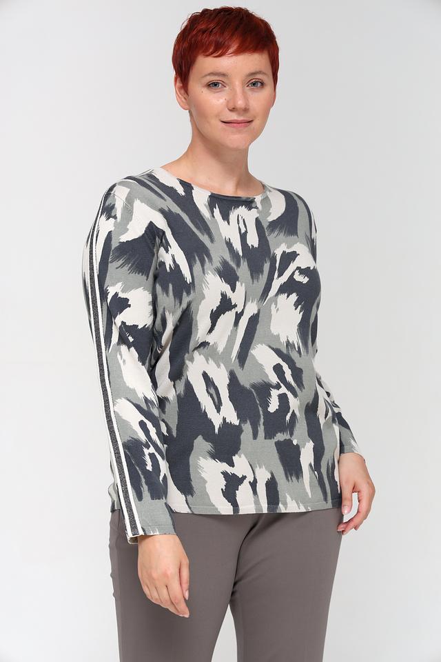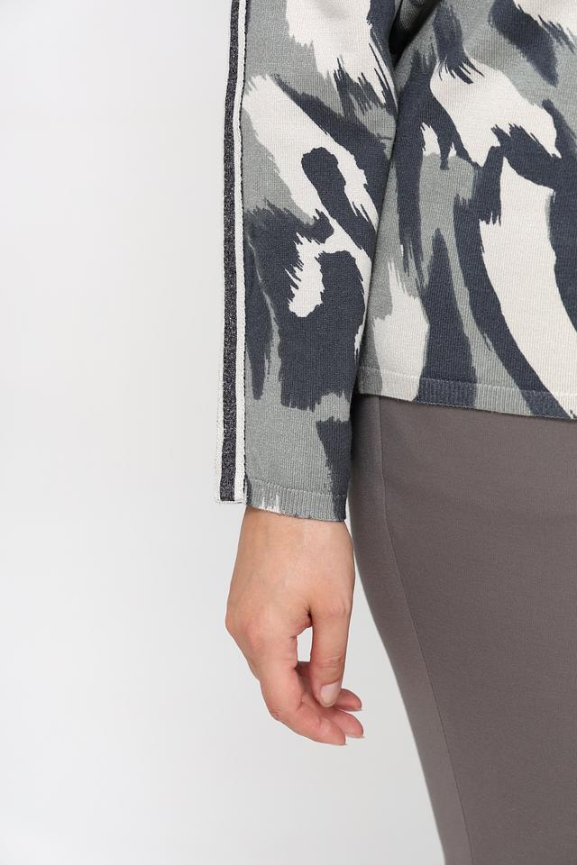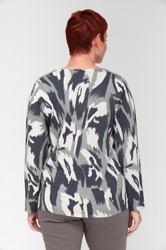 Пуловер имеет свободный крой, который не сковывает движений и позволяет создать расслабленный силуэт. Округлый вырез горловины делает его универсальным и подходящим для различных типов внешности. Особенностью модели является яркий абстрактный принт, выполненный в сочетании серых, белых и чёрных оттенков, который придаёт изделию индивидуальность и выразительность.