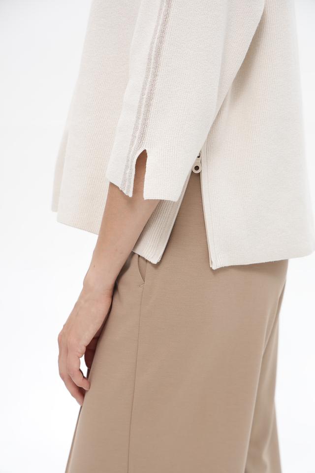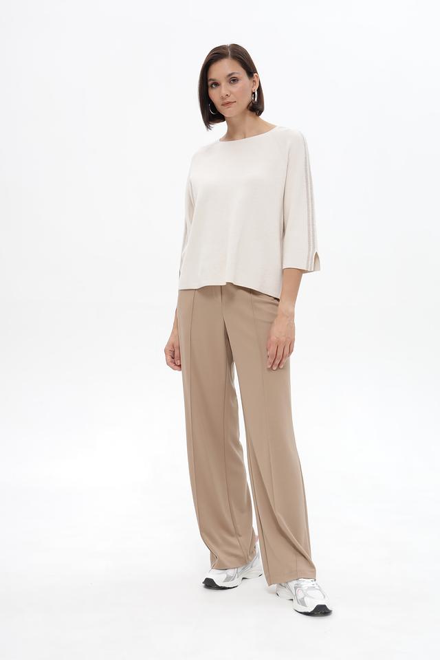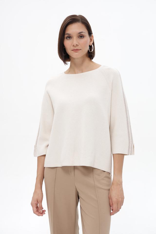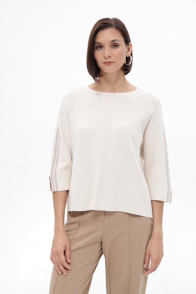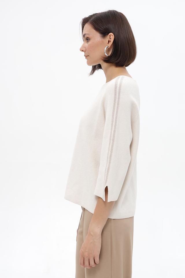 Элегантный пуловер от бренда Lecomte, выполненный в спокойном бежевом оттенке. Модель имеет круглый вырез горловины и короткие рукава 3/4 с оригинальными разрезами, добавляющими образу легкость и непринужденность.