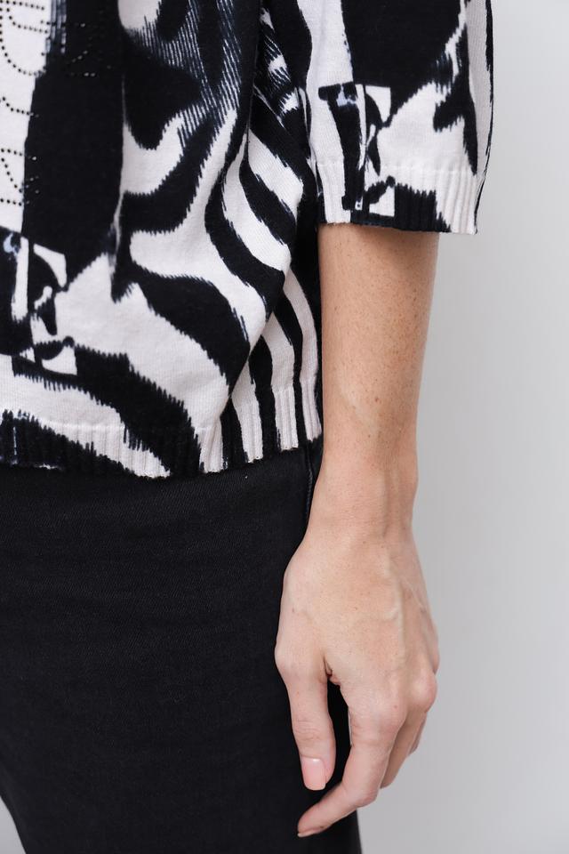 Пуловер имеет свободный крой, который не сковывает движений, и рукава три четверти, идеально подходящие для теплой погоды или для создания многослойного образа. Особенностью модели является эффектный принт с изображением зебры, выполненный в черно-белой гамме с добавлением голубых оттенков.