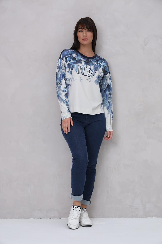Женский пуловер Lecomte белого цвета с ярким цветочным принтом и надписью "JOY". Модель выполнена из мягкого и приятного к телу сочетания хлопка, модала и эластана, обеспечивающего комфорт при носке. Состав: хлопок 47%, модал 47%, эластан 6%