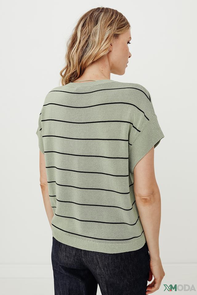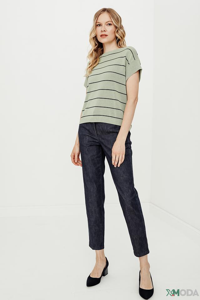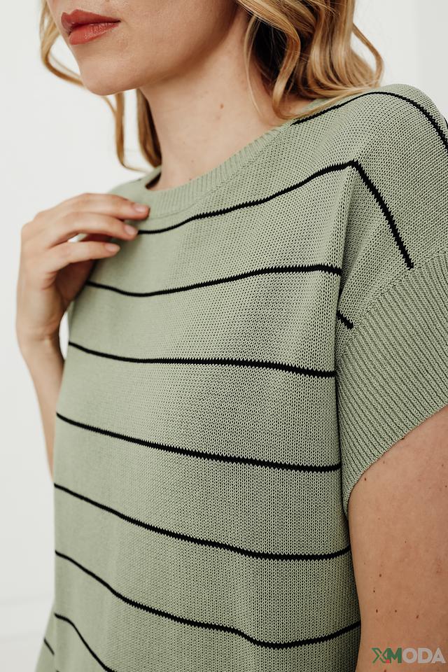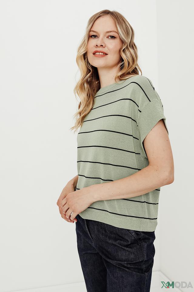Пуловер имеет прямой крой и короткий рукав, что делает его идеальным для теплой погоды. Круглый вырез горловины подчеркивает элегантность силуэта. Изготовлен из высококачественного трикотажа, состоящего из хлопка, вискозы и полиамида, что обеспечивает комфорт и долговечность изделия.