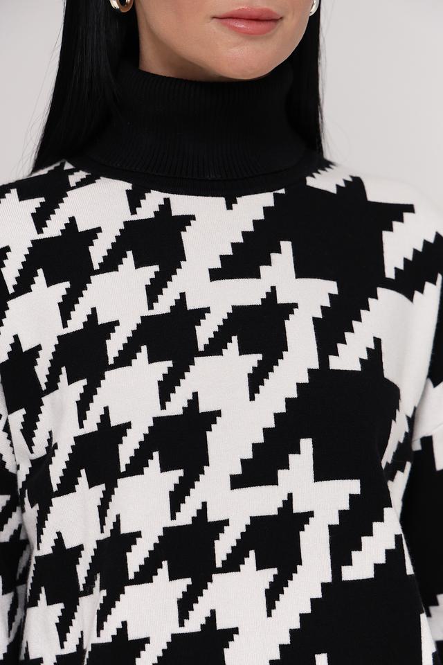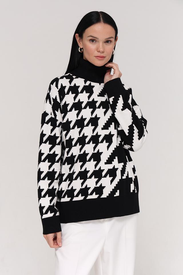 Стильный пуловер Marc Aurel чёрно-белого цвета с геометрическим принтом "гусиная лапка". Изготовлен из мягкой и приятной к телу смеси вискозы, полиэстера и полиамида. Состав: вискоза 50%, полиэстер 28%, полиамид 22%