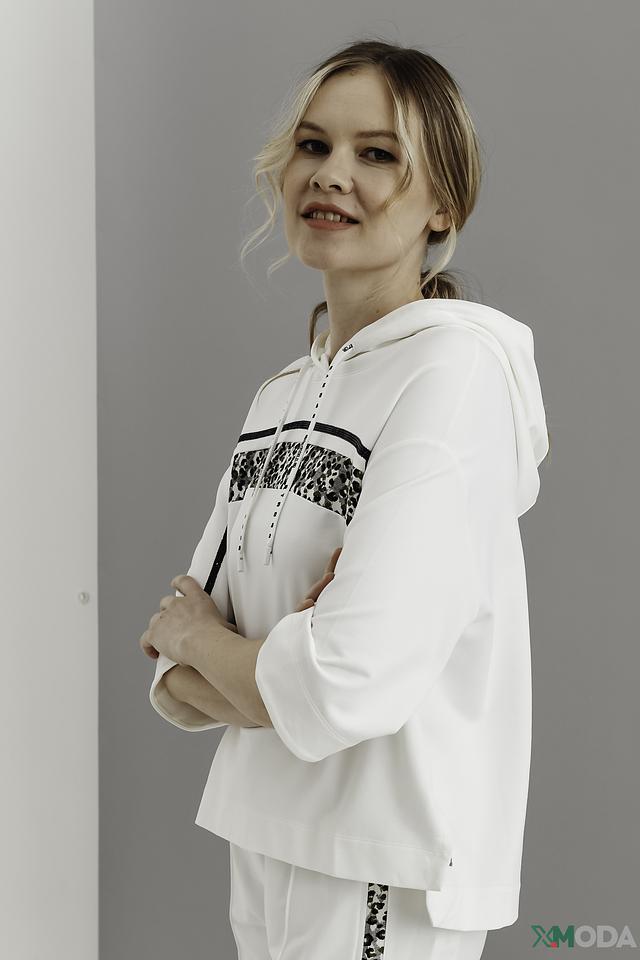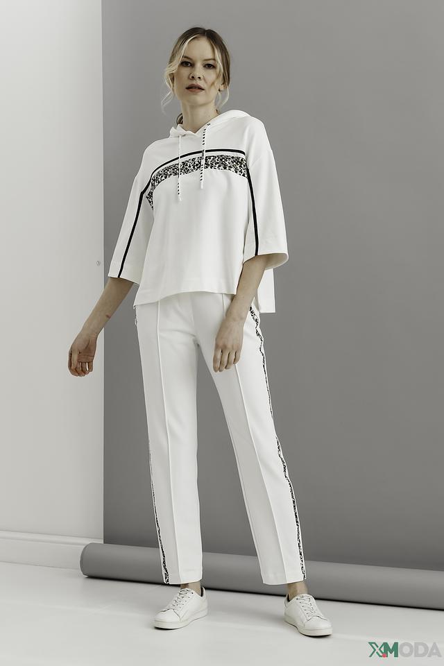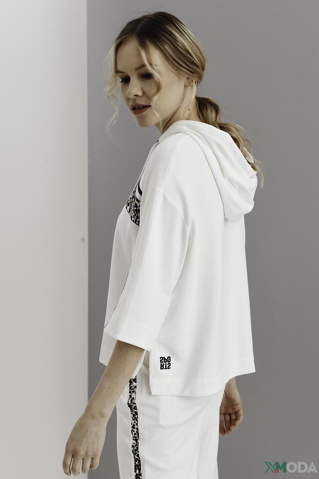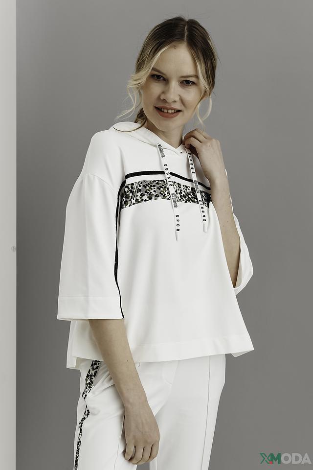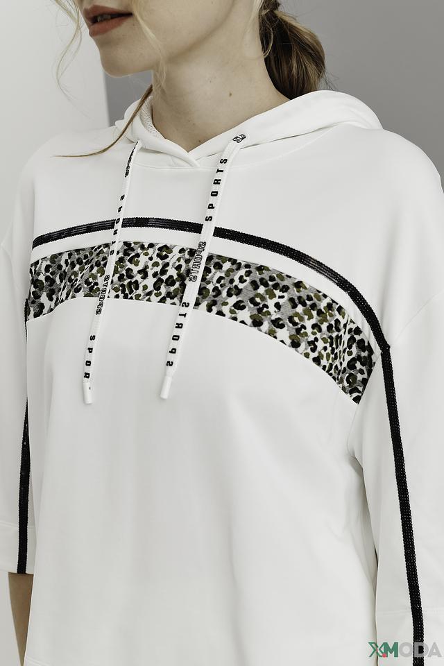 Пуловер имеет удобный крой с короткими рукавами и капюшоном, который добавляет спортивный акцент. Декоративные полосы с леопардовым принтом на рукавах и груди придают изделию оригинальность и индивидуальность.