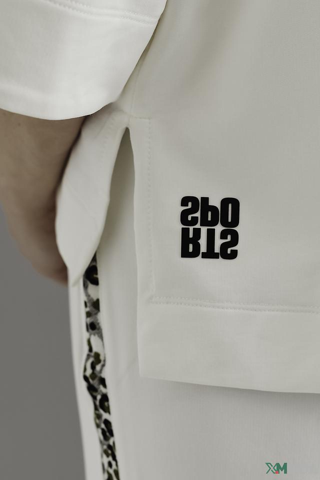 Белый пуловер Marc Cain Sports с короткими рукавами и оригинальным леопардовым принтом. Модель выполнена из мягкого трикотажа с добавлением хлопка и эластана, обеспечивающего комфорт и свободу движений. Состав: полиамид 64%, хлопок 33%, эластан 3%