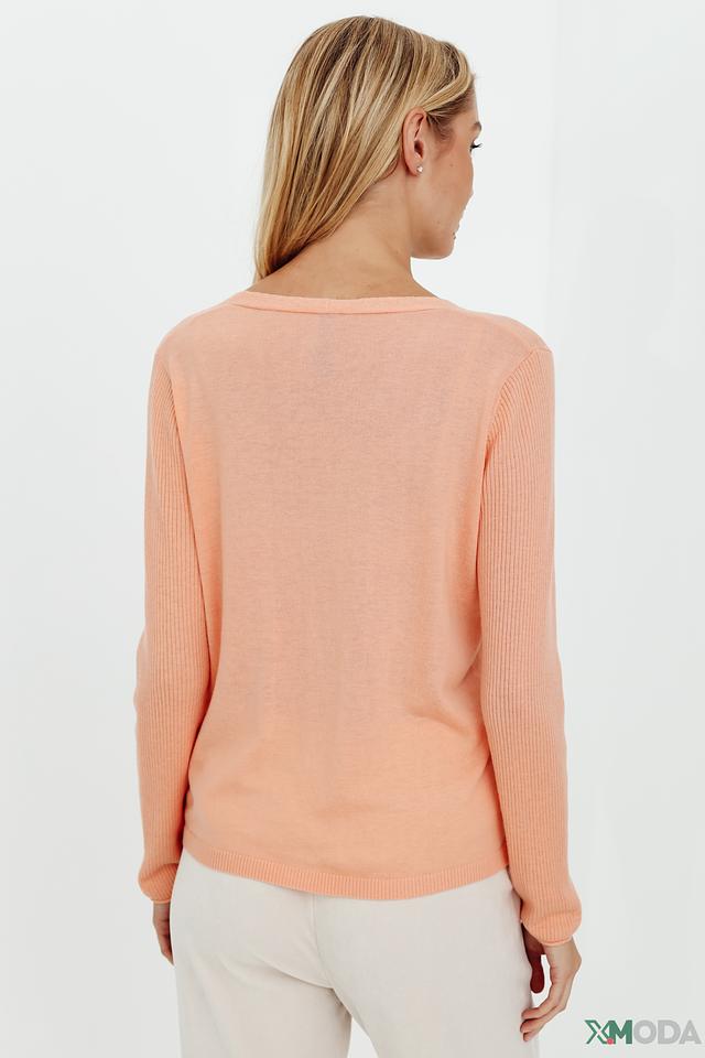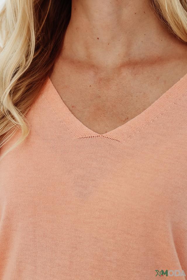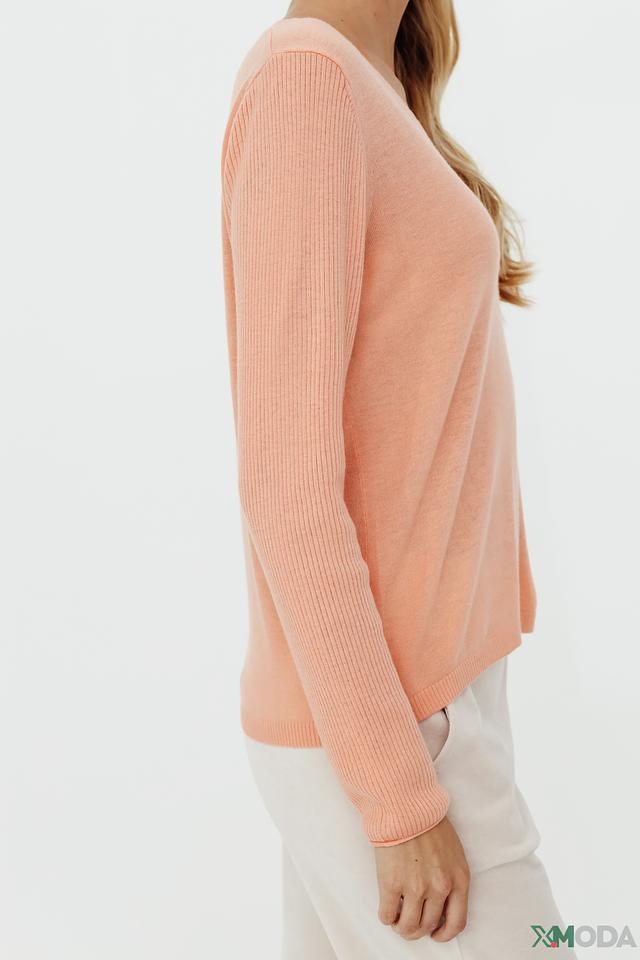 Цвет пуловера – нежный персиковый, который легко сочетается с различными элементами гардероба. Текстура вязки – мелкая, что придает изделию изысканность.