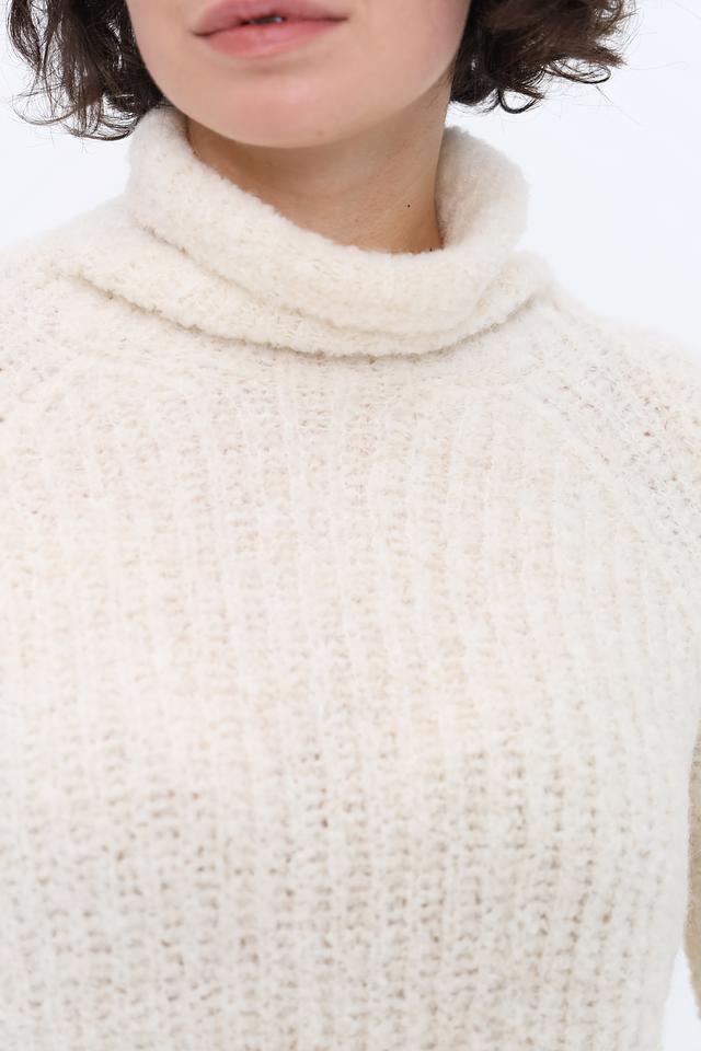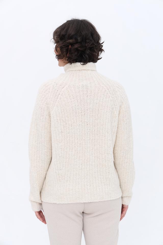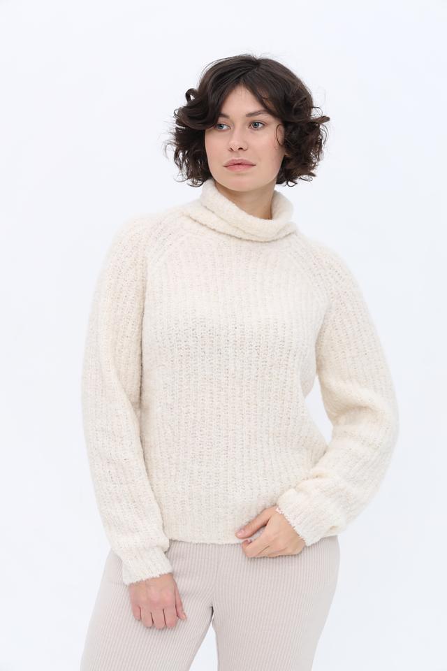 Высокий горловина не только защищает от холода, но и придает изделию элегантный вид. Объемный крой обеспечивает свободу движений и позволяет сочетать пуловер с различными элементами гардероба – от узких брюк до юбок.