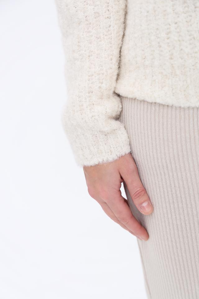 Текстура крупной вязки добавляет изделию визуальный интерес и делает его особенно уютным. Пуловер имеет нейтральный кремовый цвет, который легко сочетается с другими цветами и позволяет создавать разнообразные образы. Состав: 38% акрил, 34% альпака, 15% полиамид, 13% шерсть.
