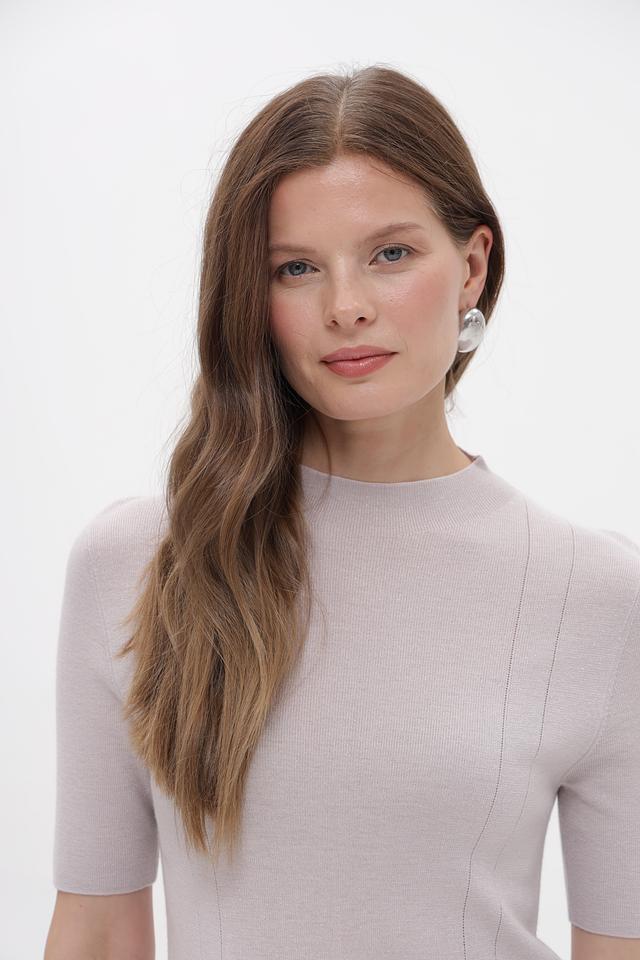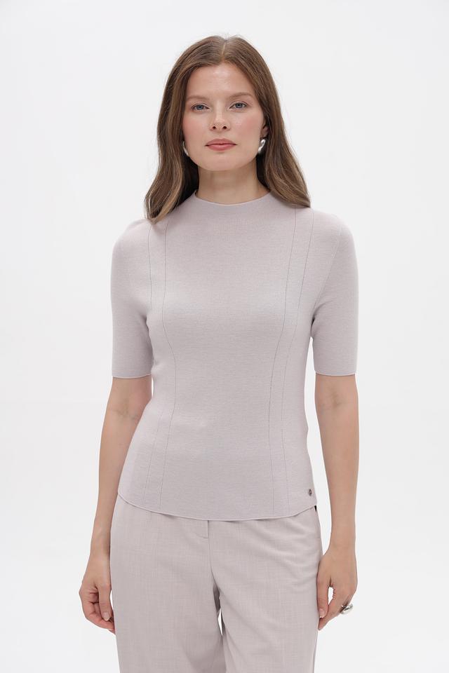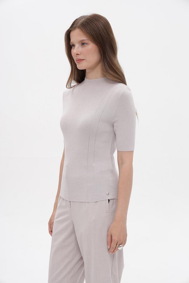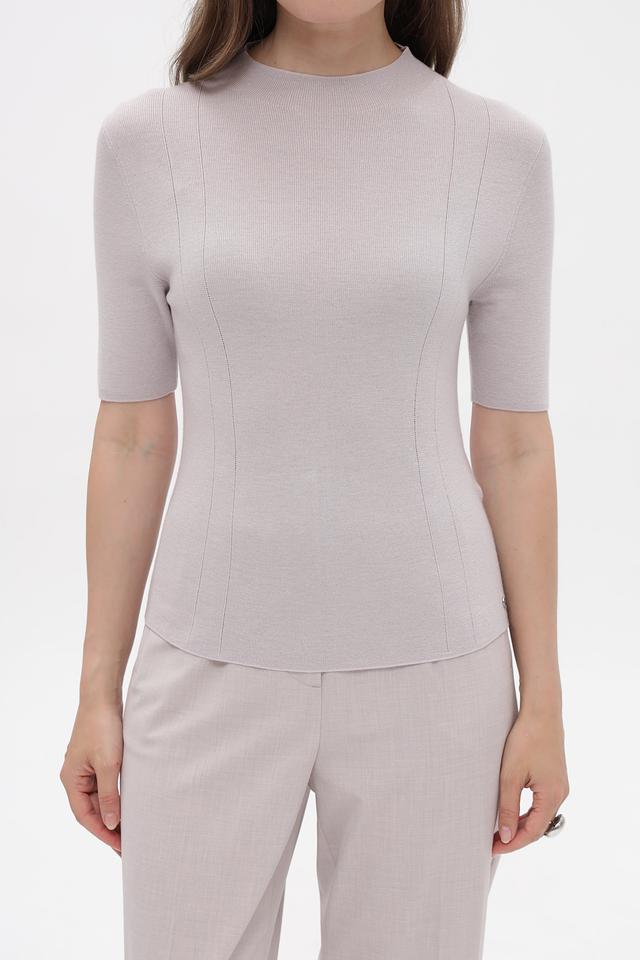 Пуловер имеет светло-серый цвет и выполнен в лаконичном дизайне. Короткие рукава и приталенный силуэт делают его идеальным для создания как повседневных, так и более формальных образов. Вертикальные вставки визуально вытягивают фигуру и добавляют оригинальности.