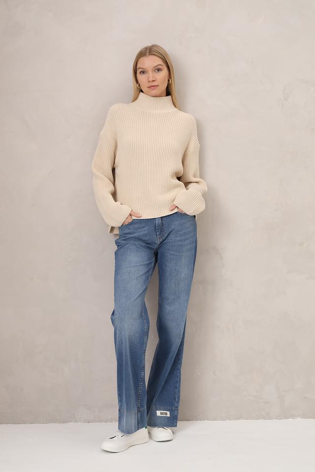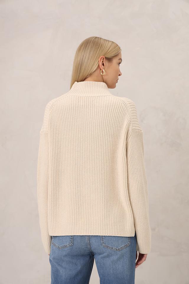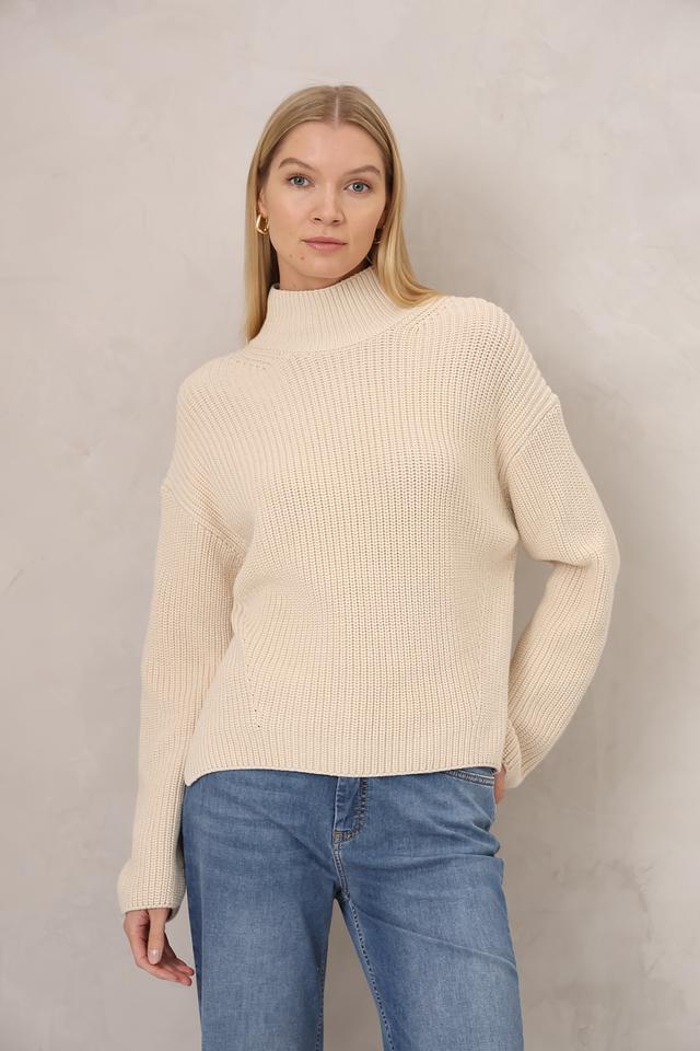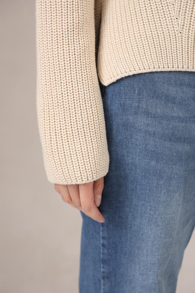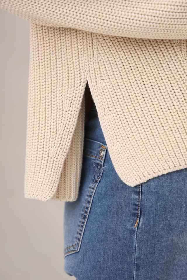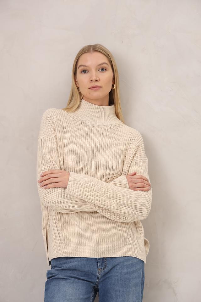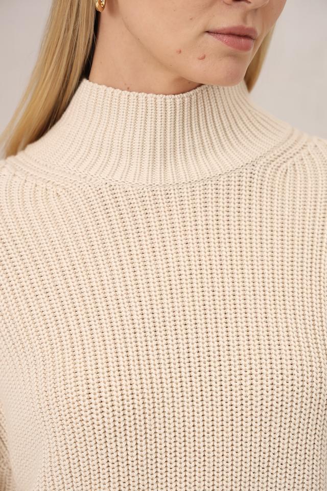 Пуловер имеет свободный крой, который не сковывает движения и создает расслабленный образ. Высокий воротник добавляет элегантности и защищает от холода. Текстура крупной вязки придает изделию объем и визуальный интерес.