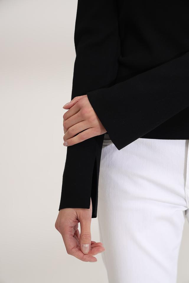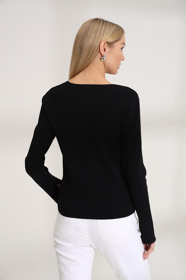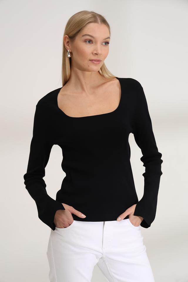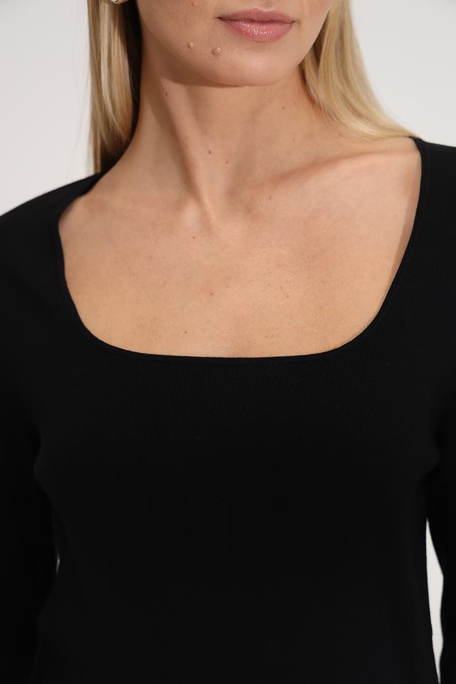 Модель имеет классический чёрный цвет и лаконичный дизайн. Квадратный вырез горловины придает образу элегантность, а длинные рукава с небольшим расклешением в области манжет добавляют оригинальности.