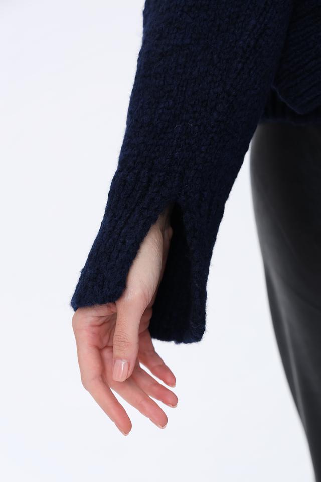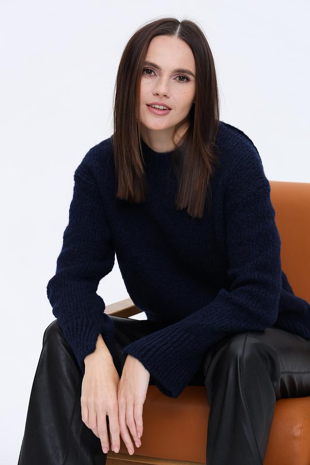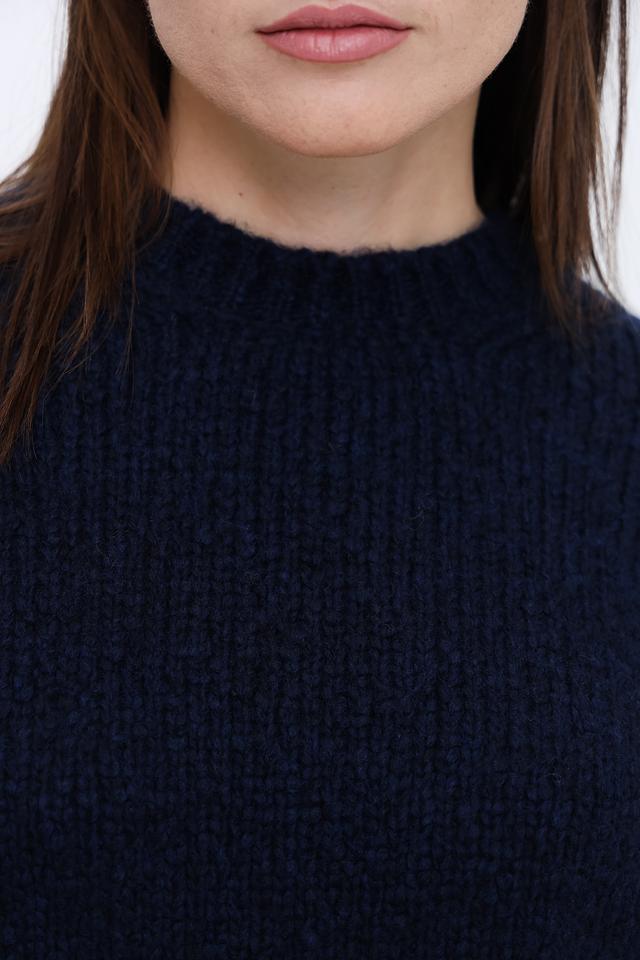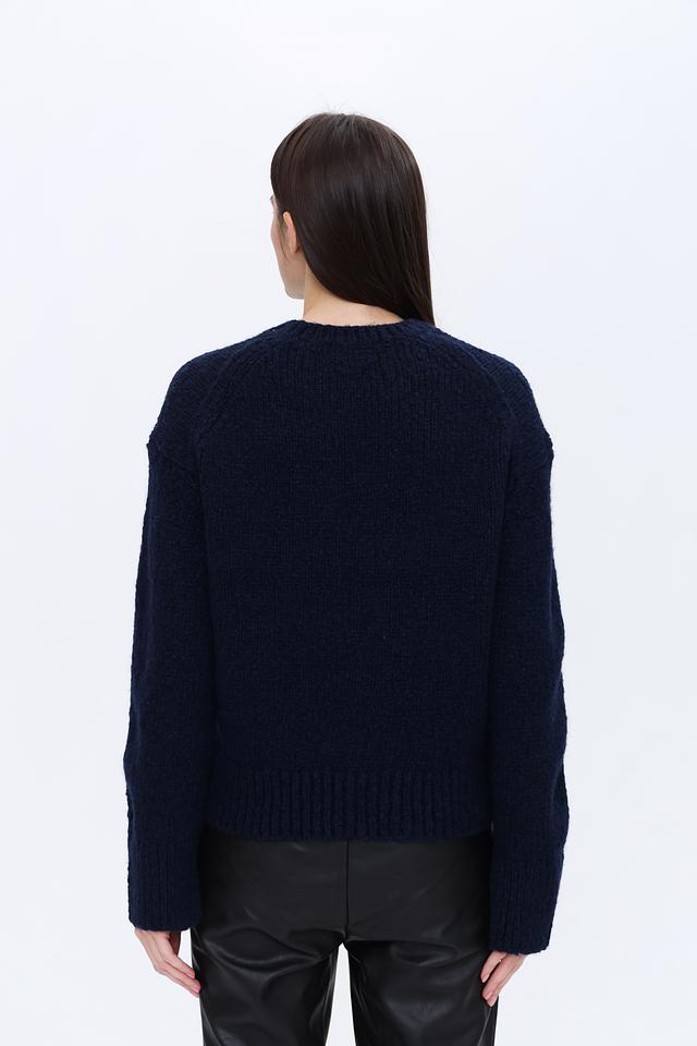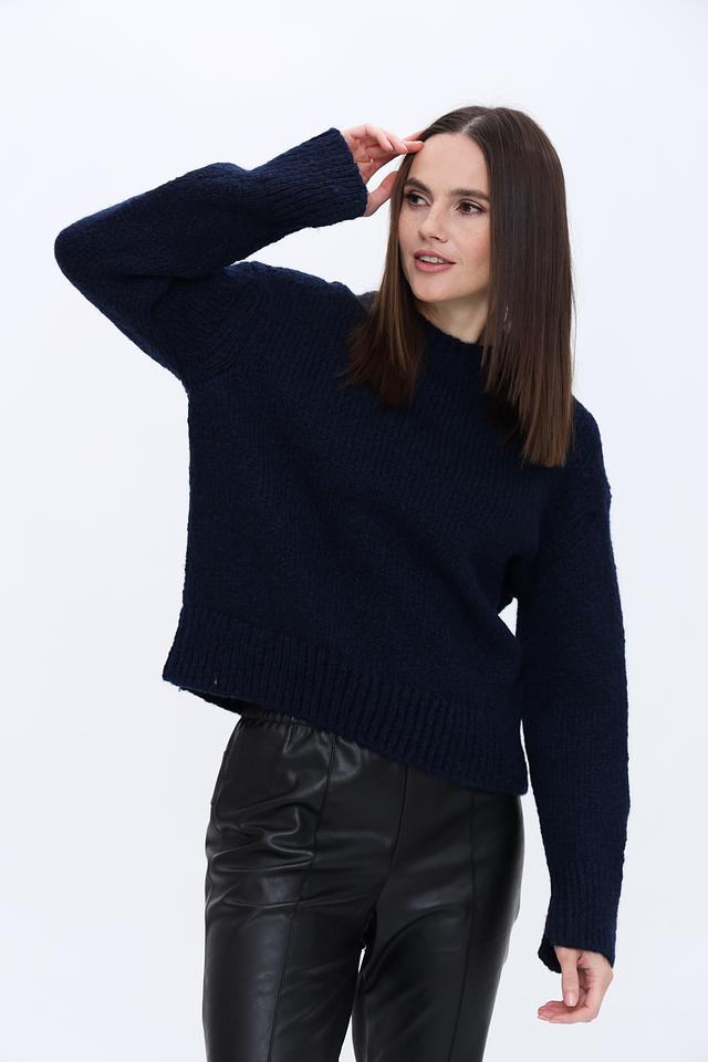 Пуловер имеет классический тёмно-синий цвет, который легко сочетается с различными элементами гардероба. Свободный крой не сковывает движений, а круглый вырез горловины придает образу непринужденность.