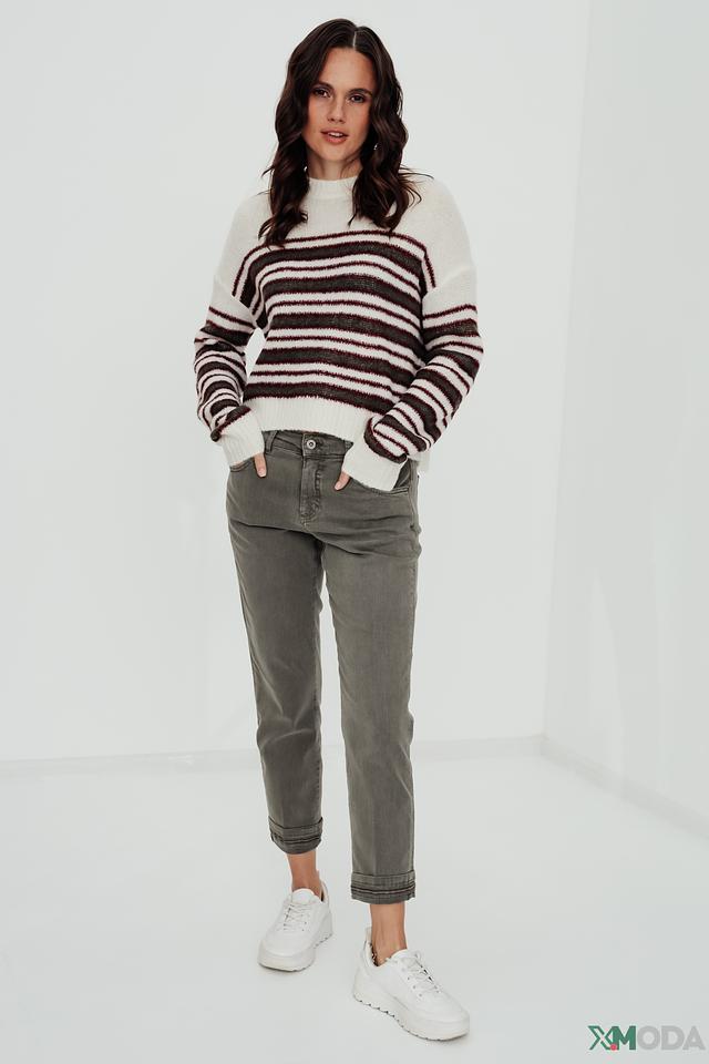 Этот стильный пуловер от Marc O Polo выполнен в белом цвете и украшен ярким полосатым узором в бордовых и серых тонах. Модель имеет классический крой с круглым вырезом горловины и длинными рукавами.