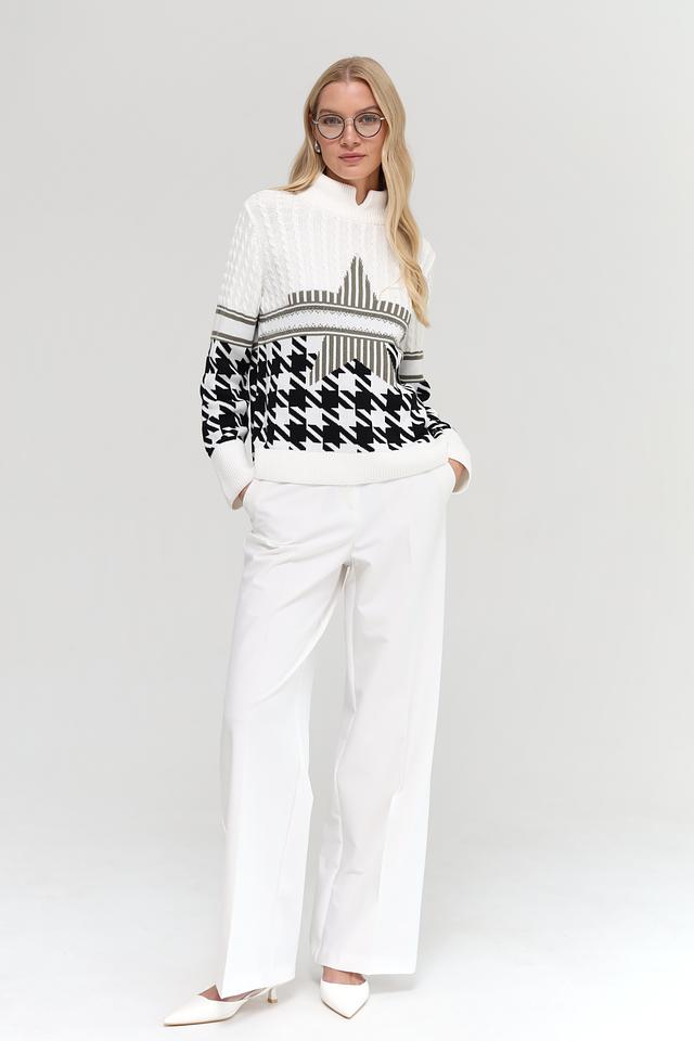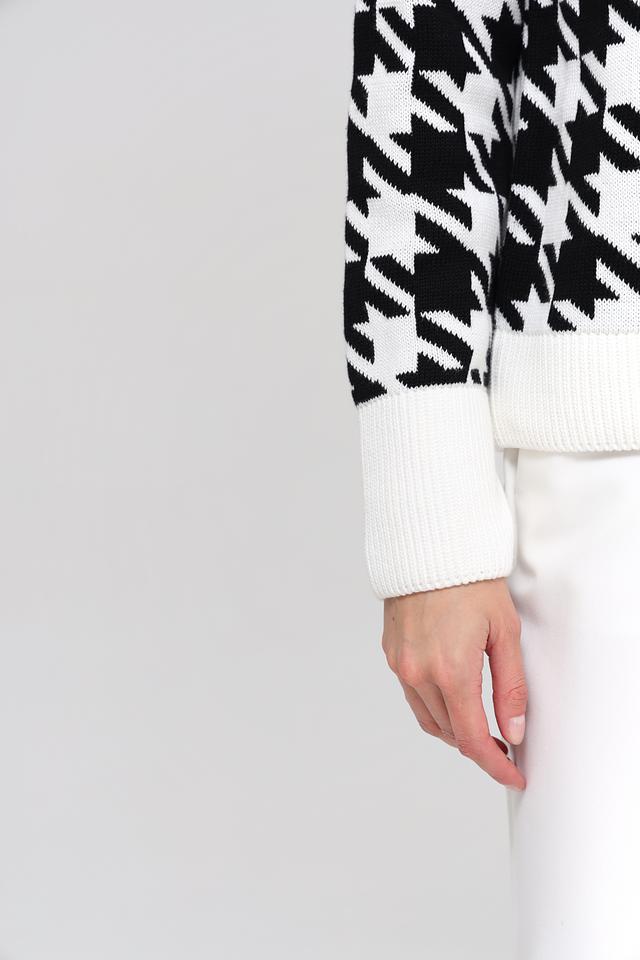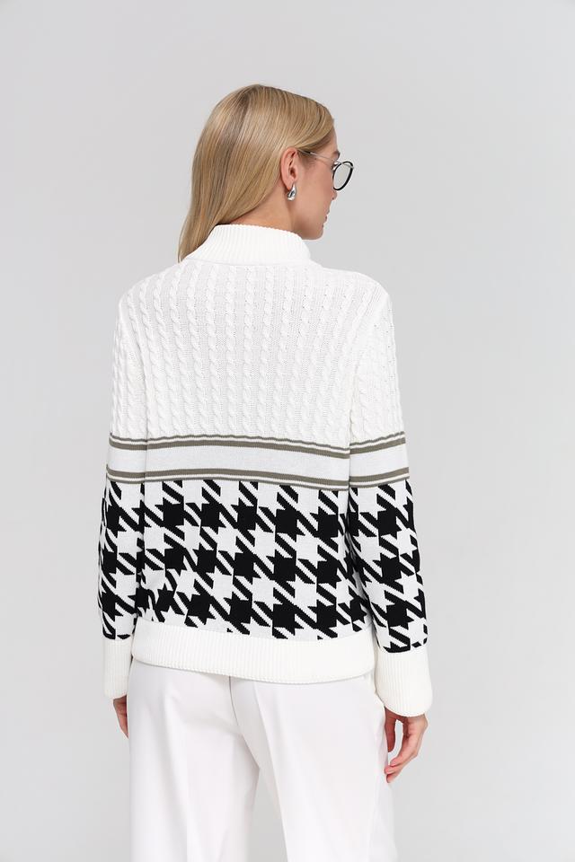 Белый пуловер Monari с оригинальным дизайном в клетку "гусиная лапка" и геометрическим узором станет стильным дополнением к вашему гардеробу. Изготовлен из 100% хлопка, обеспечивая комфорт и удобство в носке. Состав: хлопок 100%