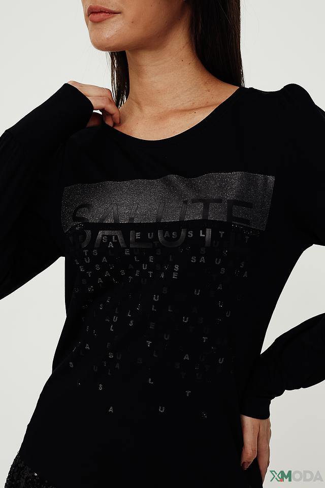 Пуловер имеет прямой крой и длинные рукава. Передняя часть украшена эффектным принтом с логотипом бренда, выполненным в серебристом цвете, что придает изделию особый шарм и индивидуальность.