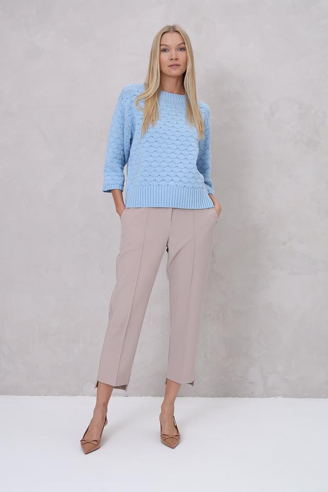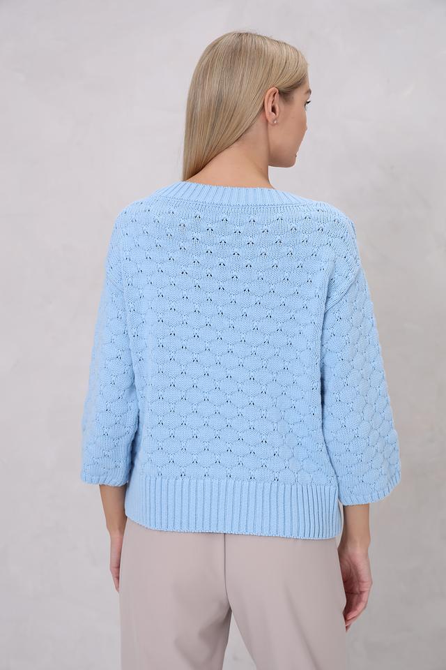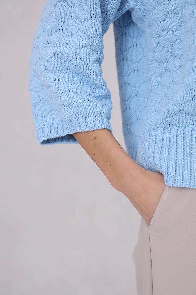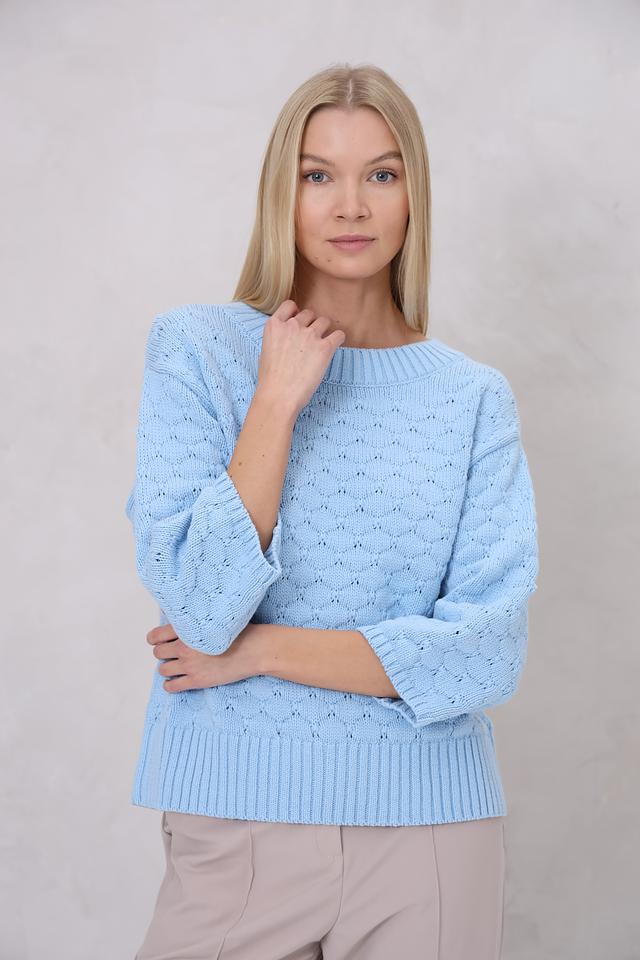 Женский пуловер Monari нежного голубого цвета выполнен из мягкого трикотажа с ажурным узором. Модель имеет округлый вырез горловины и рукава 3/4, что делает ее универсальной для создания различных образов. Состав: хлопок 60%, полиакрил 40%