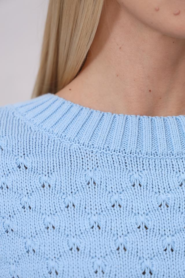 Нежный голубой цвет пуловера легко сочетается с различными элементами одежды, позволяя создавать разнообразные стильные комплекты. Этот пуловер идеально подойдет для повседневной носки, а также для особых случаев. Он станет вашим любимым предметом гардероба, который всегда будет актуален.