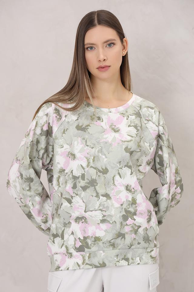 Особенностью данной модели является яркий цветочный принт, выполненный в нежных оттенках зелёного, розового и белого. Этот принт делает пуловер особенно женственным и привлекательным. Состав: 96% полиэстер, 4% эластан.