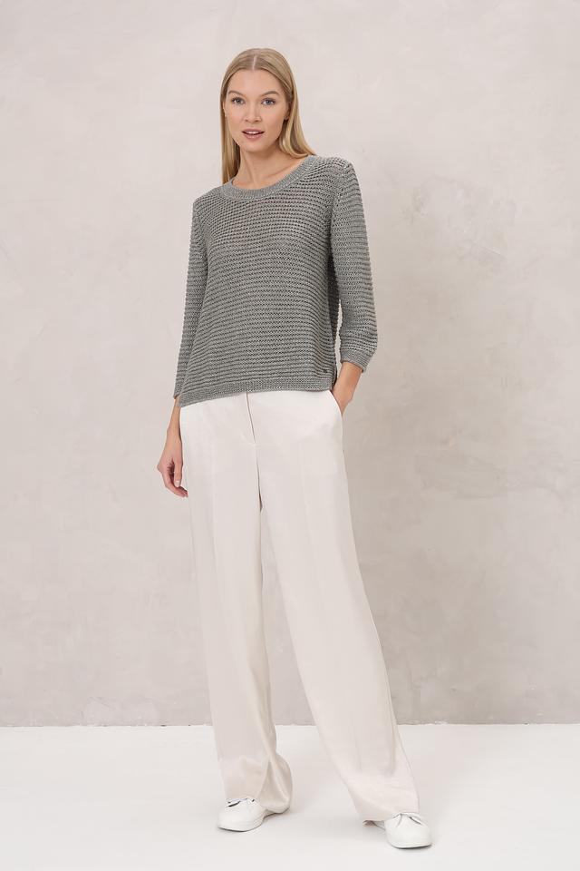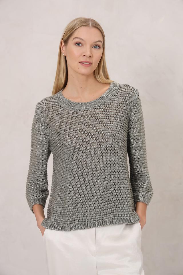 Серый пуловер Monari из вискозы с добавлением металлизированной нити. Модель имеет круглый вырез горловины и свободный крой, что обеспечивает комфорт и стиль в повседневном образе. Состав: вискоза 68%, метализ.нить 32%