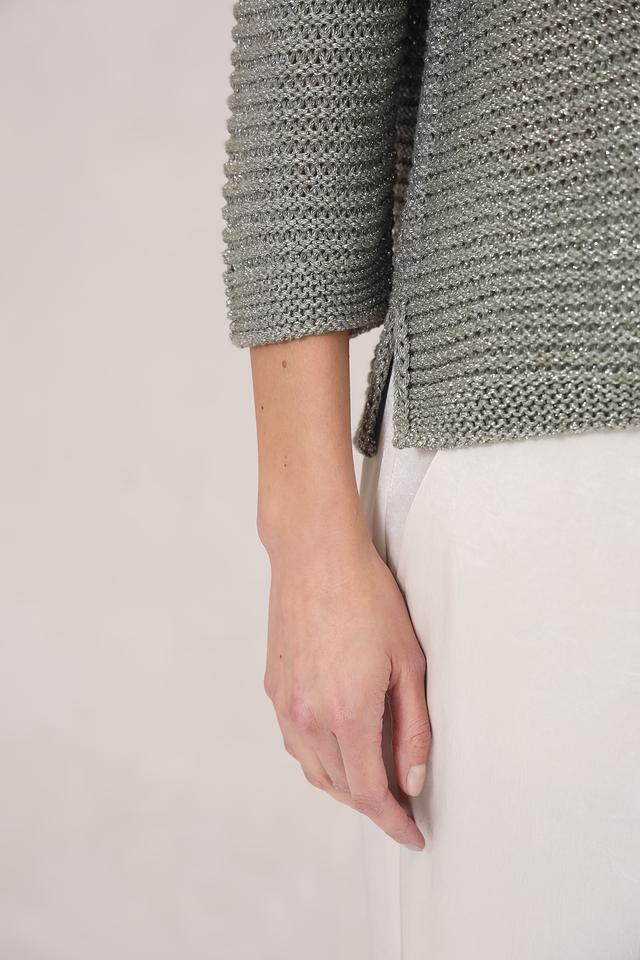 Состав ткани: 68% вискоза, 32% металлизированная нить. Пуловер приятен к телу, хорошо держит форму и не требует особого ухода.