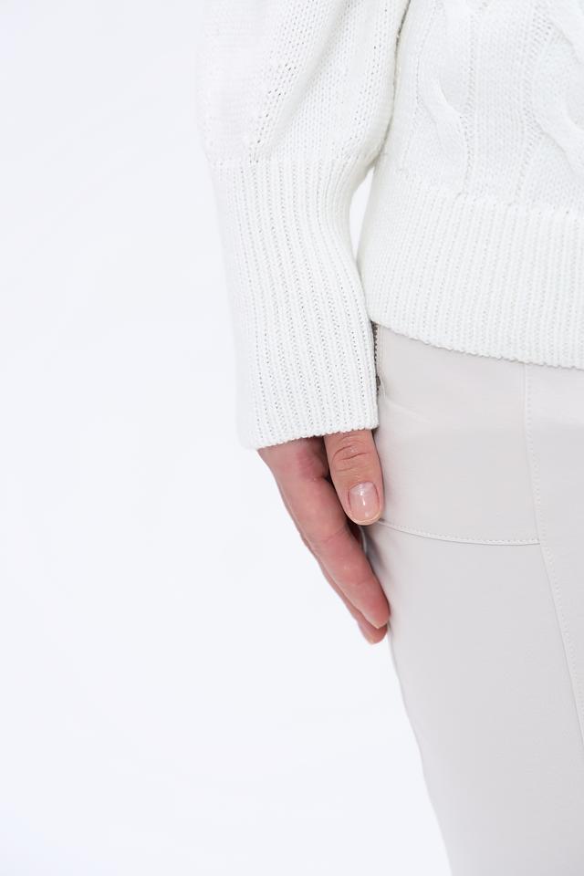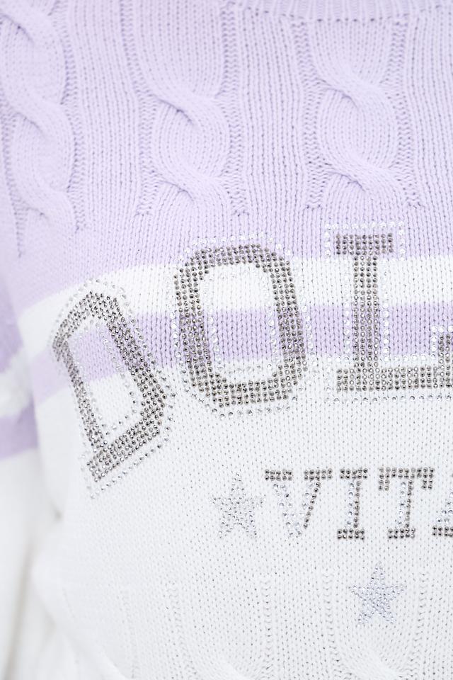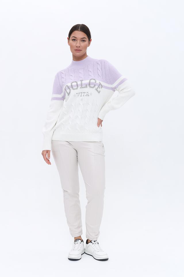 Передняя часть пуловера украшена вышивкой с надписью "DOLCE VITA", выполненной с использованием сверкающих элементов, что придает изделию особый шарм. Узор "косы" на белой части пуловера добавляет текстуры и визуального интереса.