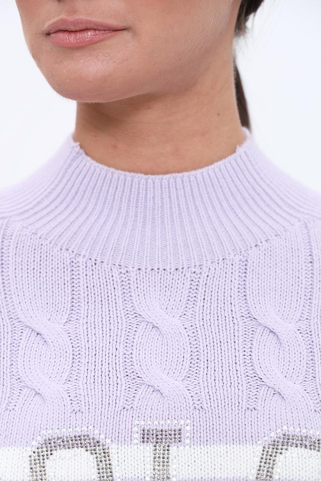 Женский пуловер Monari лавандового и белого цвета с декоративной вышивкой "DOLCE VITA" и узором "косы". Модель выполнена из мягкого хлопкового трикотажа с добавлением полиакрила для сохранения формы. Состав: хлопок 60%, полиакрил 40%