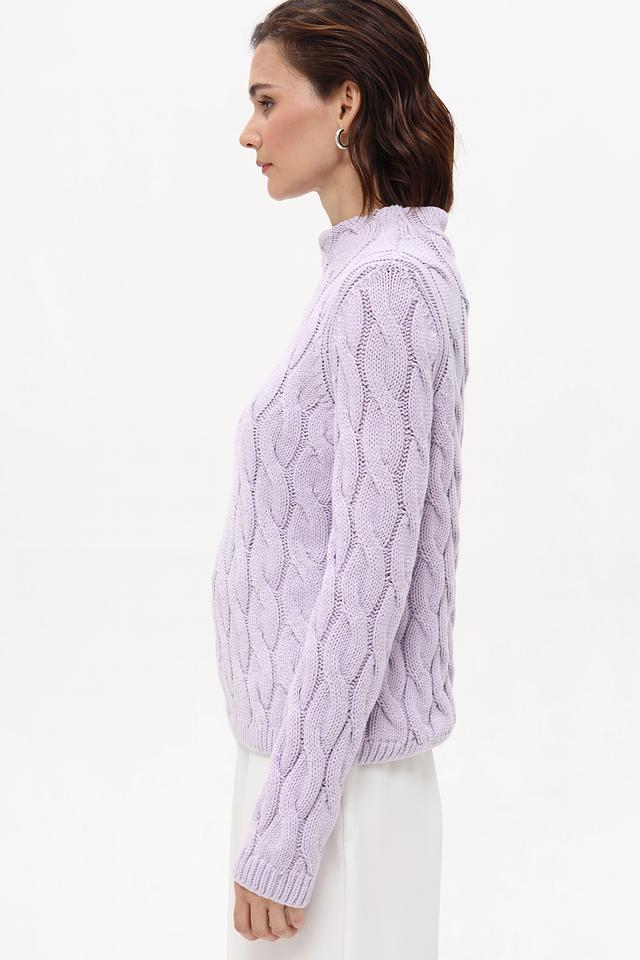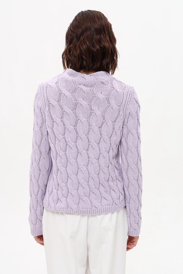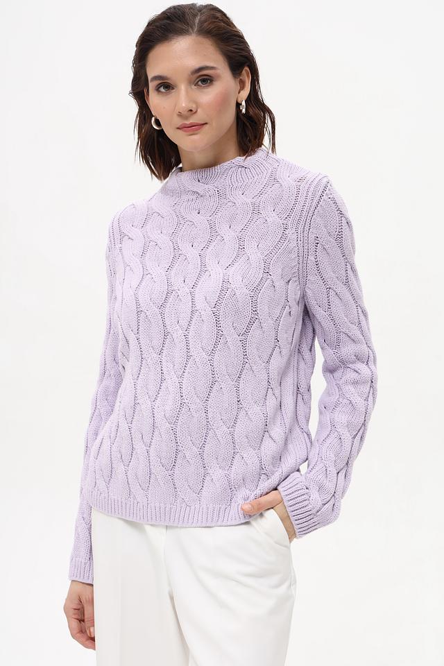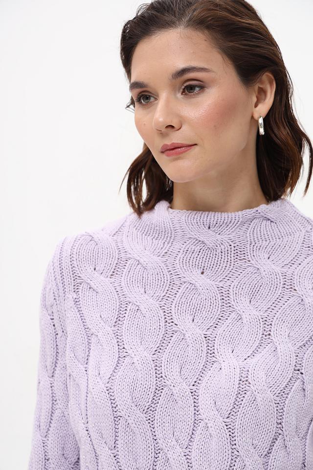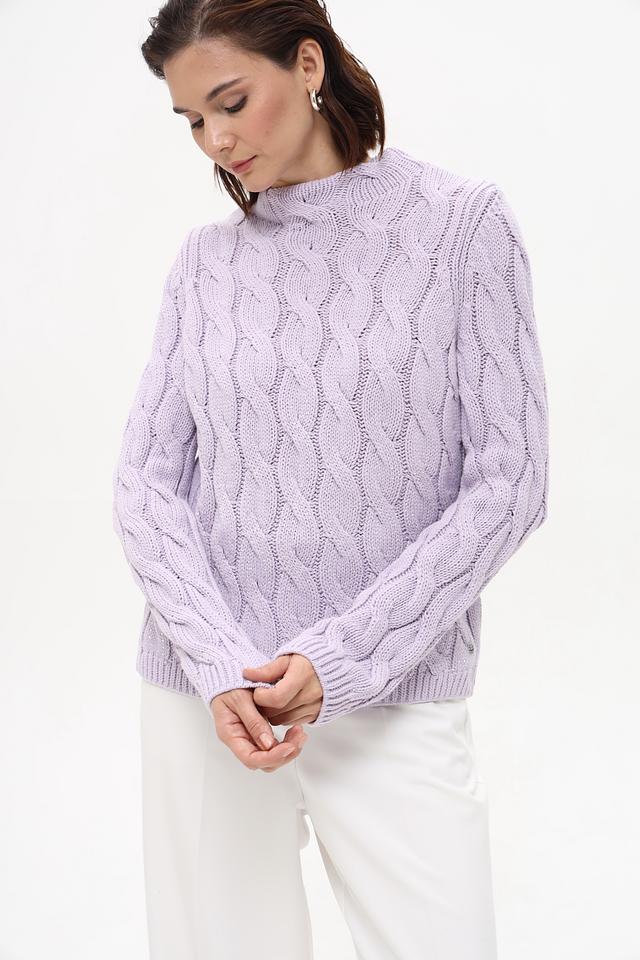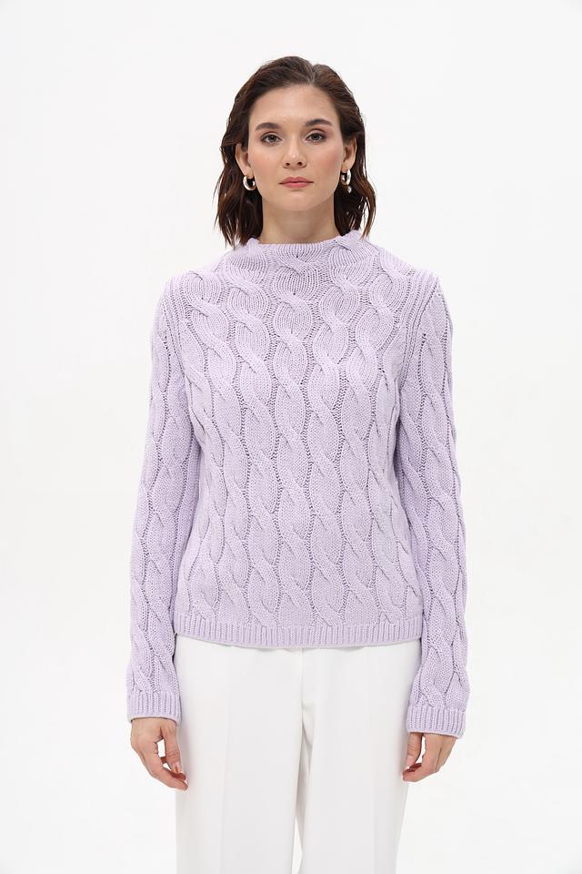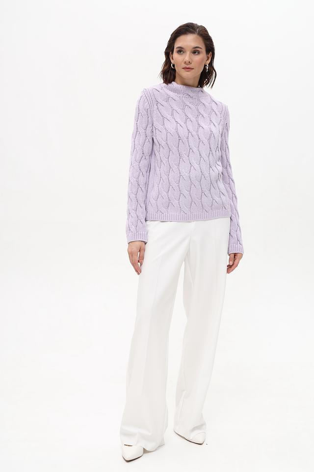 Пуловер имеет нежный лавандовый оттенок и украшен рельефным узором из кос, придающим ему изысканность и оригинальность. Высокий воротник добавляет элегантности образу. Классический силуэт и удобный крой делают этот пуловер идеальным для повседневной носки.