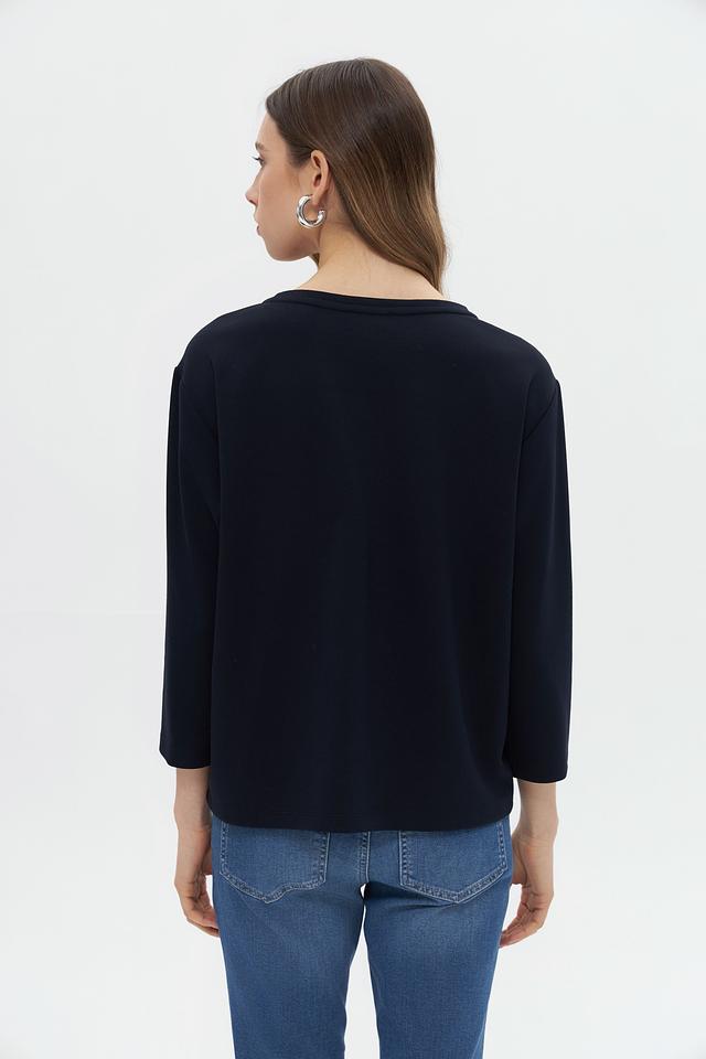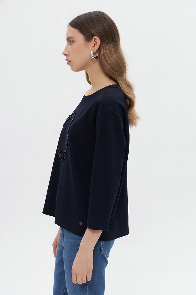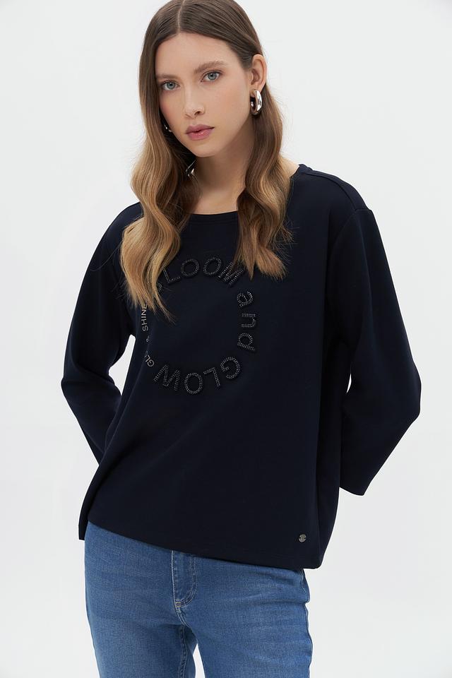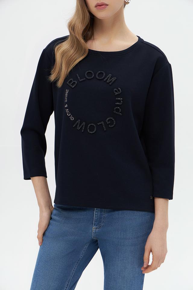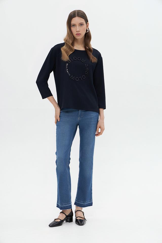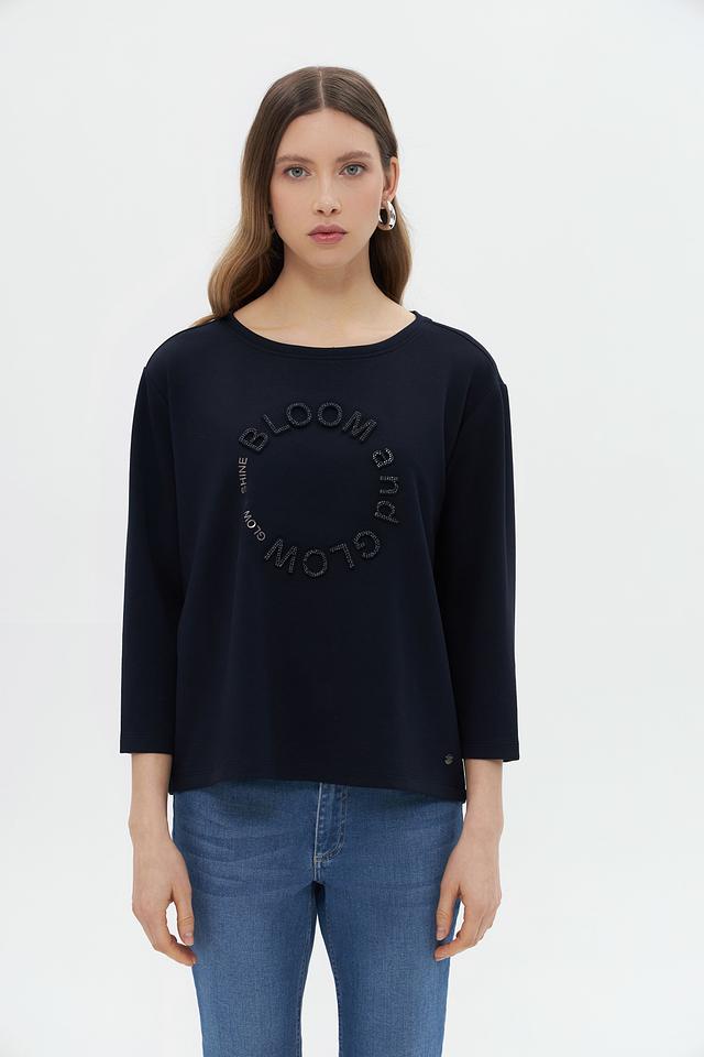 Пуловер имеет тёмно-синий цвет и украшен круглым принтом с надписью "Bloom and Glow", выполненным в тон изделия. Вырез горловины – округлый, рукава – три четверти. Слегка спущенная линия плеч придает модели расслабленный и современный вид.