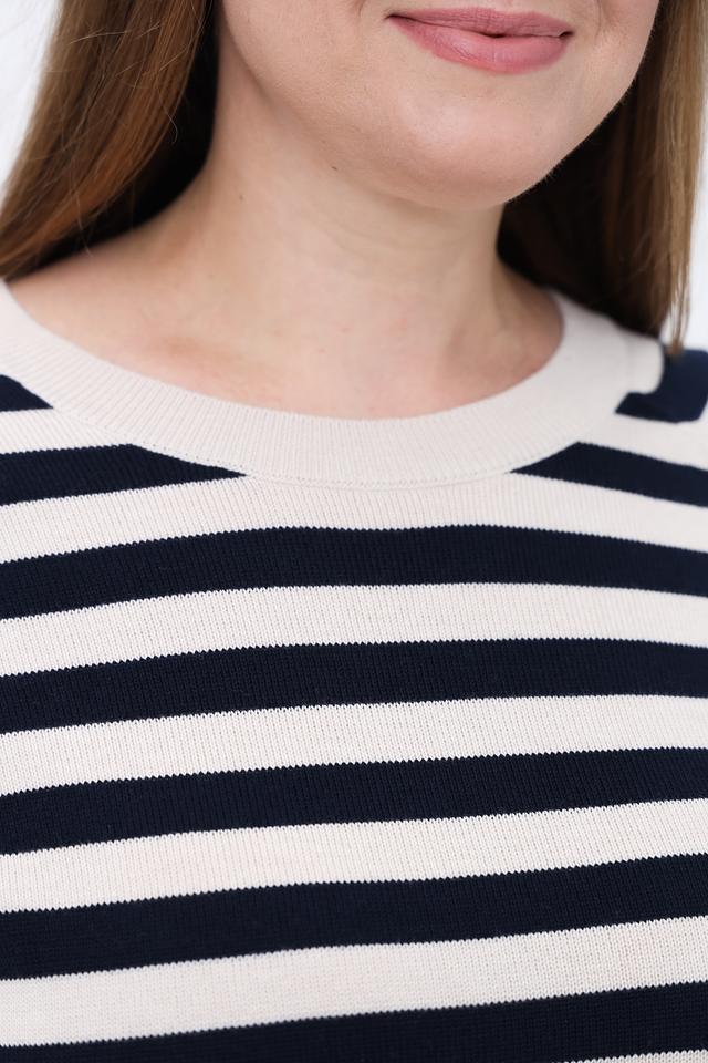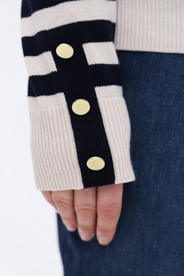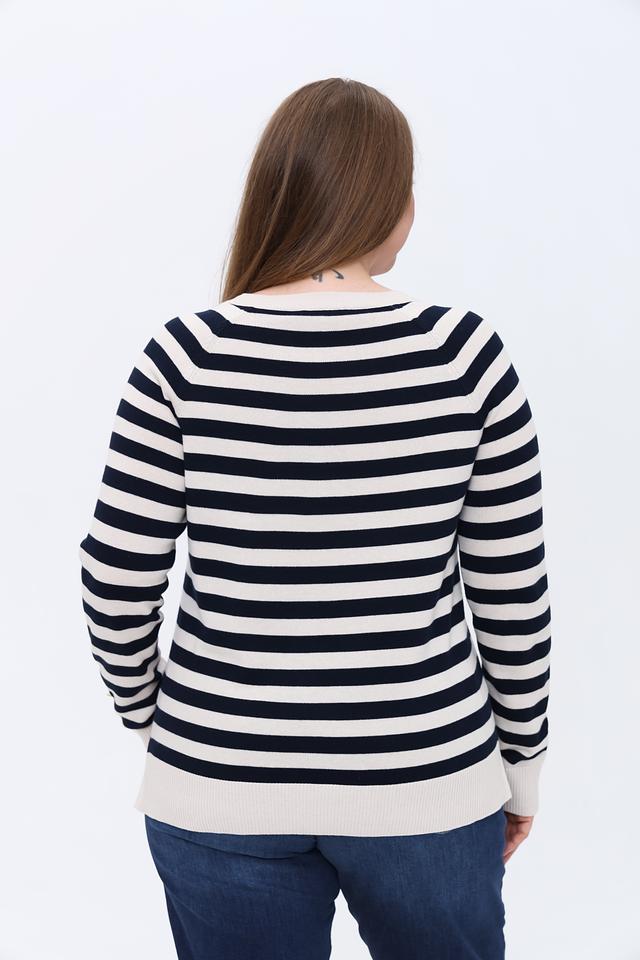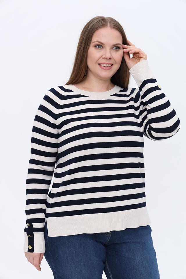 Женский пуловер Olsen бежевого и тёмно-синего цвета в классическую полоску. Модель выполнена из мягкого трикотажа с добавлением акриловых волокон, имеет длинные рукава и круглый вырез горловины. Декорирован пуговицами на рукавах. Состав: хлопок 50%, полиакрил 50%