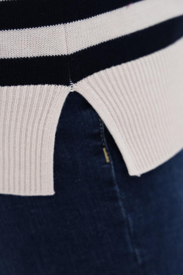 Этот стильный пуловер от бренда Olsen станет отличным дополнением к вашему гардеробу. Пуловер выполнен в классическом дизайне с горизонтальной полоской, сочетающей в себе бежевый и тёмно-синий цвета.