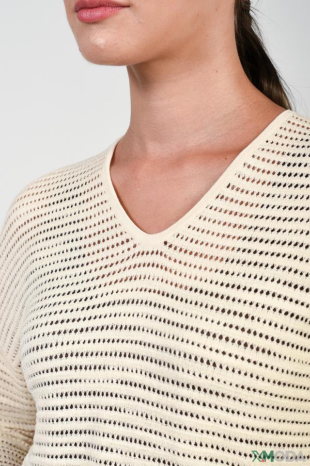 Пуловер имеет V-образный вырез и короткие рукава, что делает его идеальным для теплой погоды. Ажурная вязка придает изделию легкость и воздушность, а также добавляет изысканности образу.