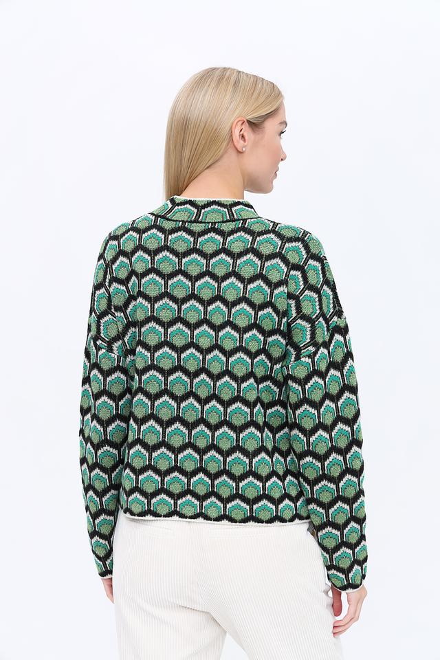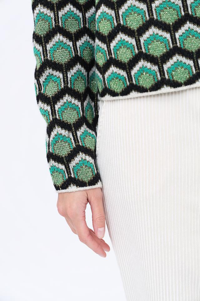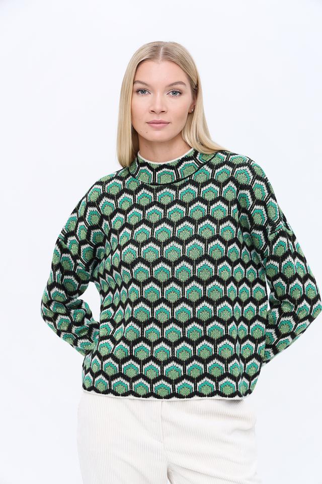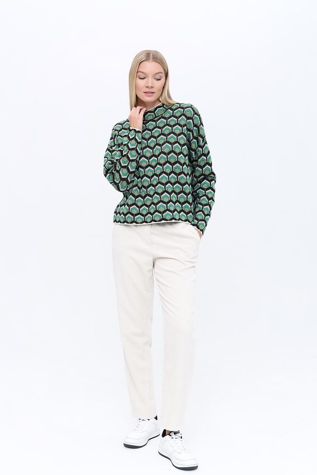 Этот стильный пуловер от бренда Oui выполнен в свободной посадке и имеет удобный вырез горловины. Основной цвет изделия – зеленый, дополненный черным и белым геометрическим узором, создающим эффектный визуальный образ.