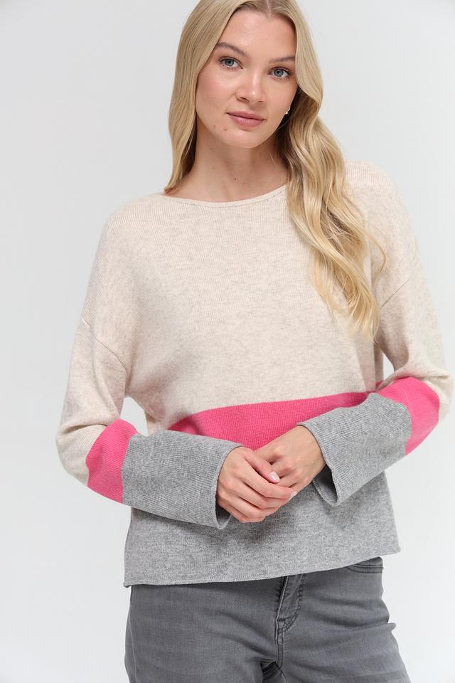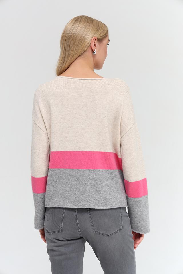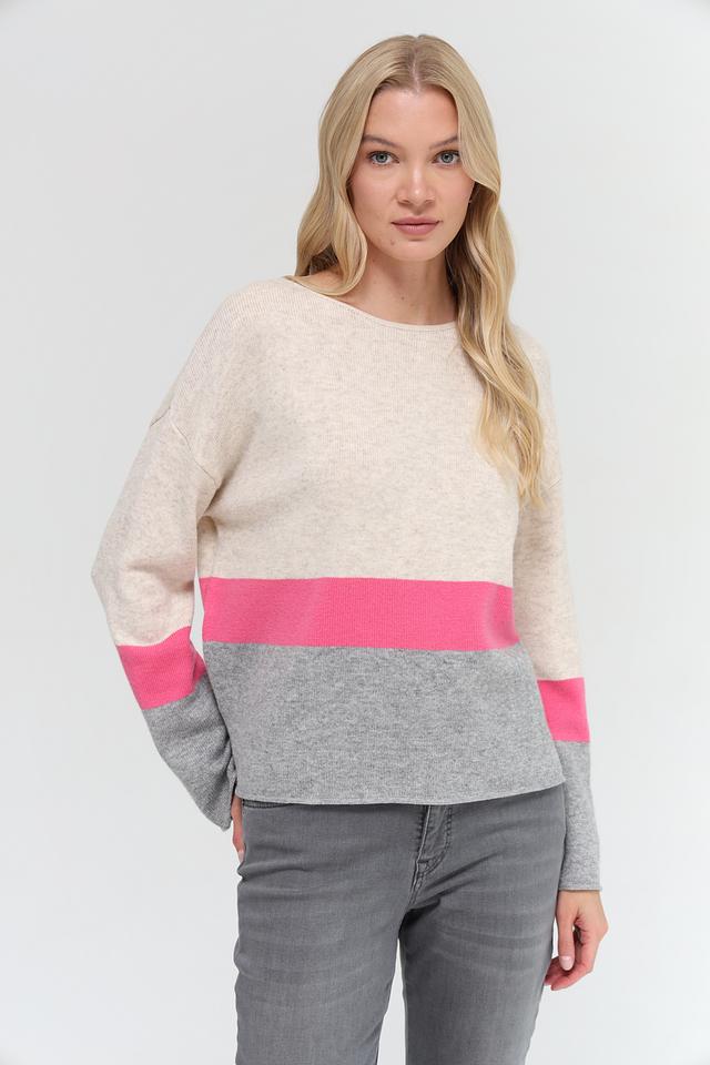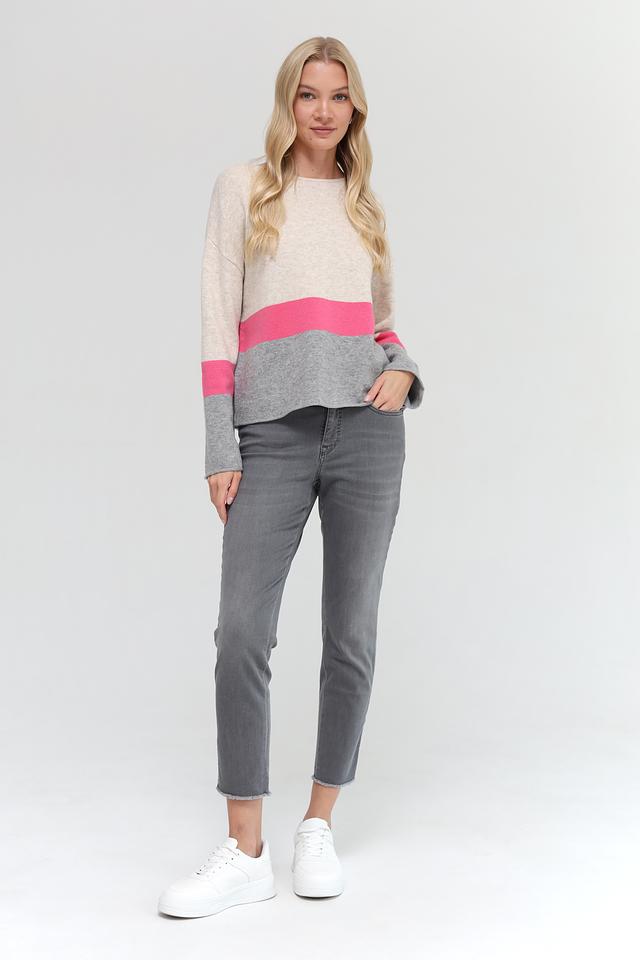 Пуловер имеет оригинальный дизайн с горизонтальными полосами бежевого, розового и серого цветов. Круглый вырез горловины и свободный крой обеспечивают комфорт в носке. Длинные рукава завершают образ.