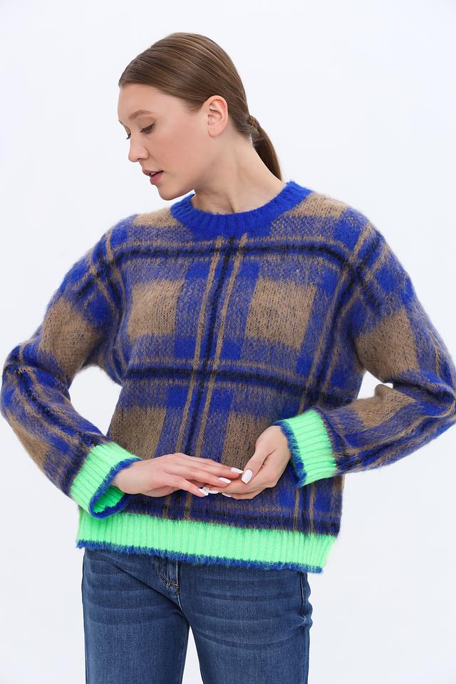 Стильный пуловер Oui синего цвета с ярким клетчатым узором и неоново-зелёной отделкой. Модель выполнена из мягкой пряжи с добавлением альпаки, что обеспечивает комфорт и тепло. Идеальный выбор для создания уютного и модного образа. Состав: полиакрил 45%, полиамид 35%, альпака 20%